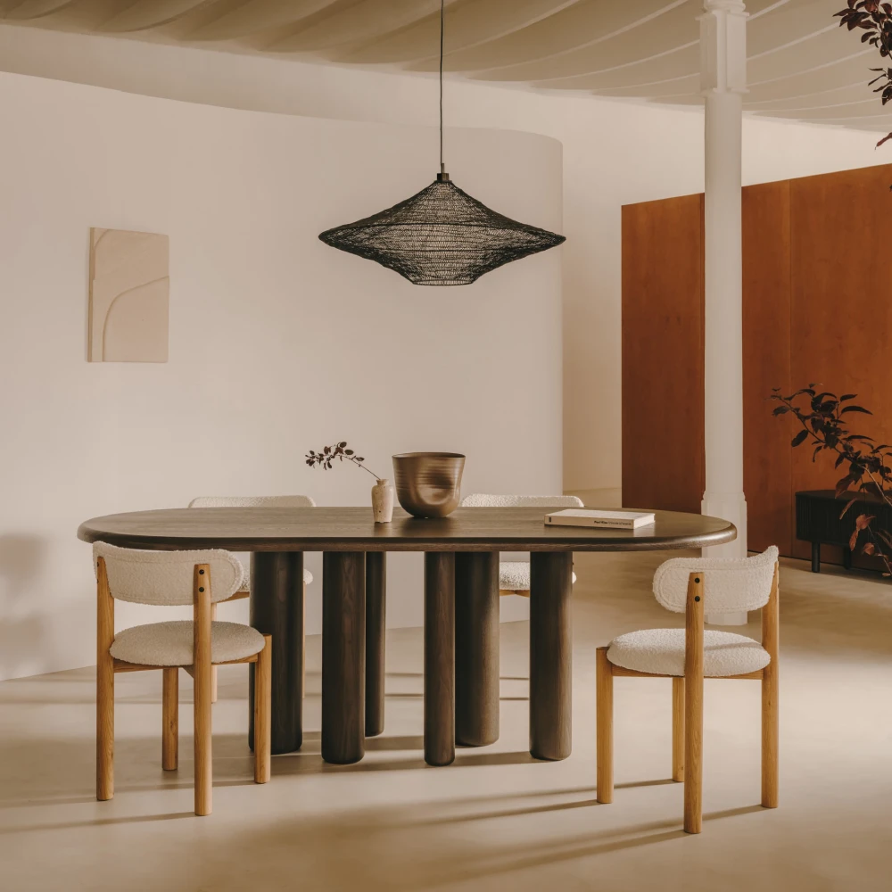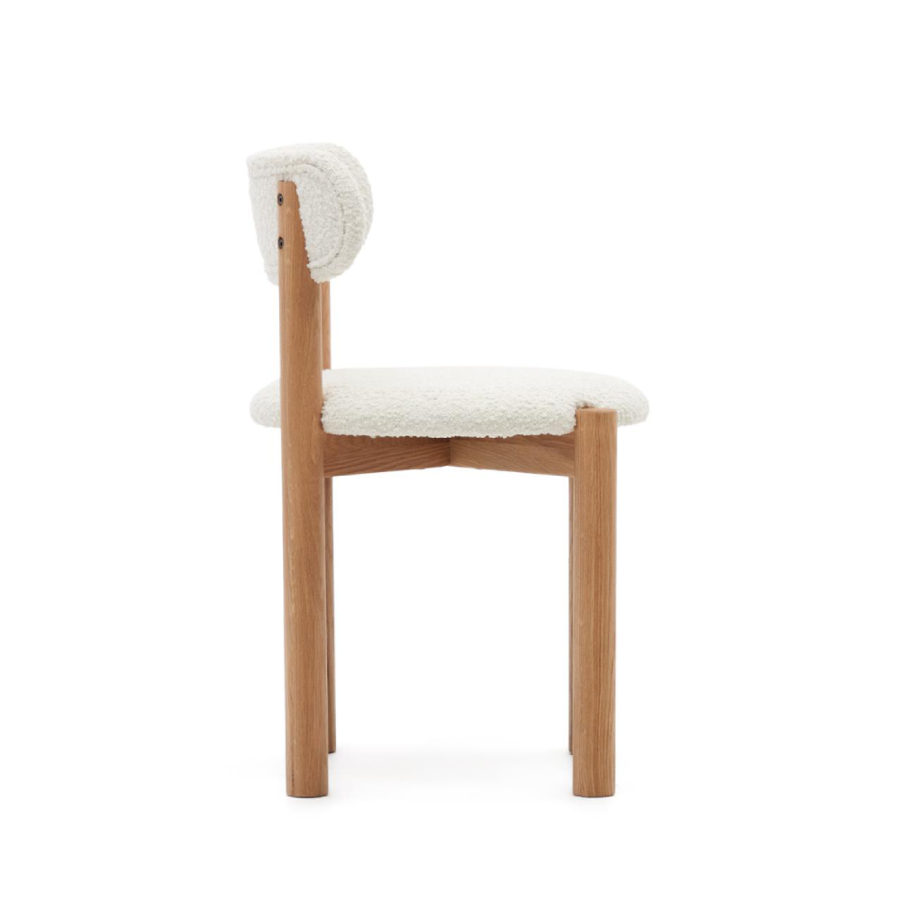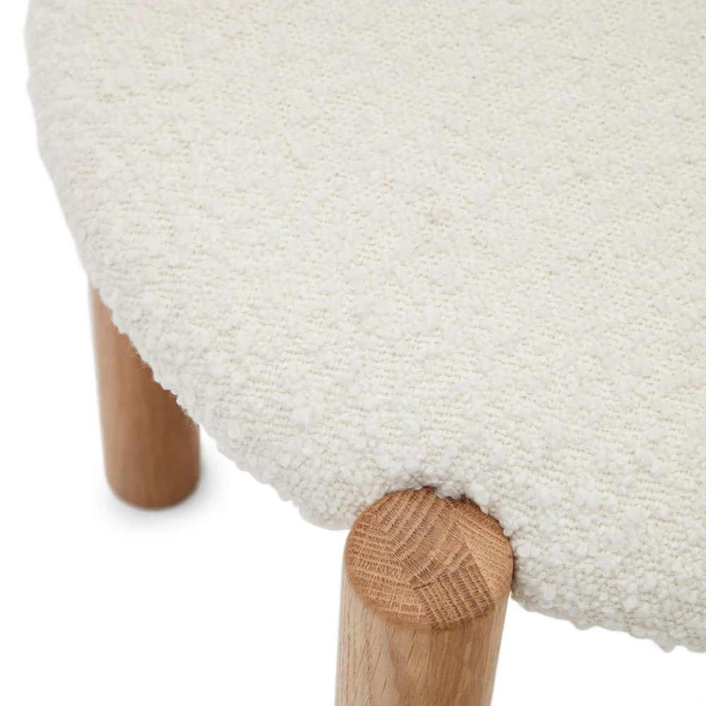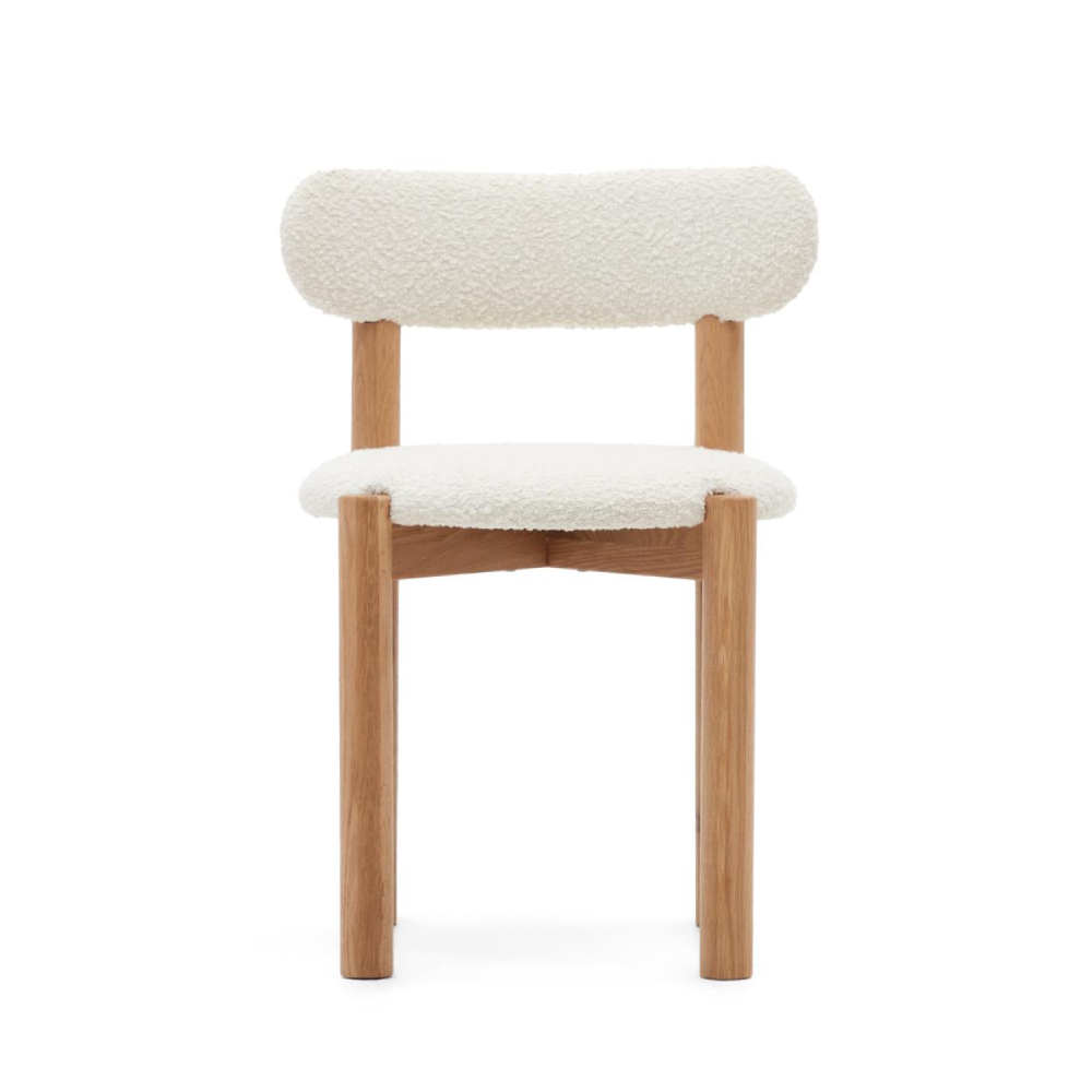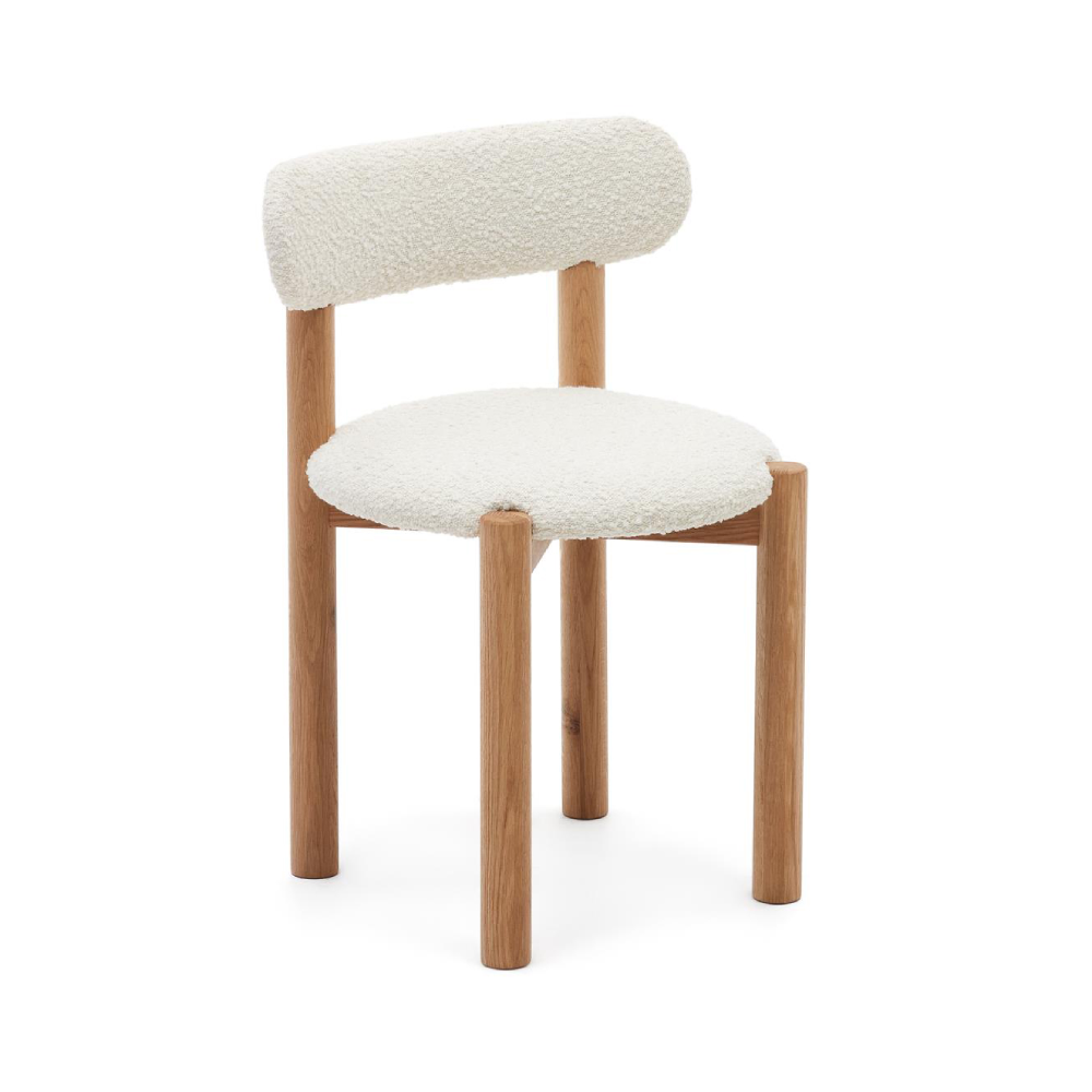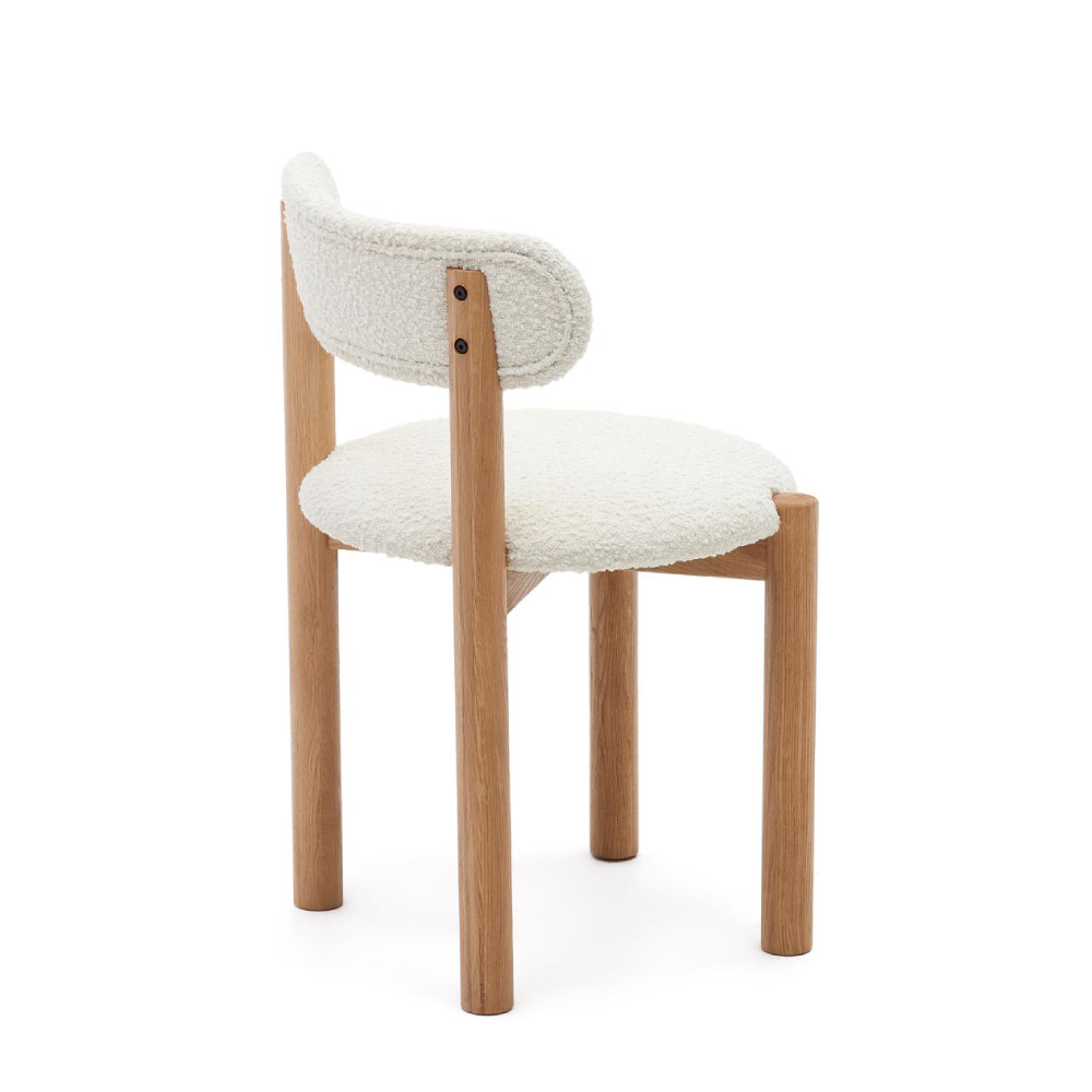 - A Cadeira Neban destaca-se pela combinação equilibrada da madeira maciça de carvalho com o tecido bouclé branco, resultando numa peça confortável e sofisticada.