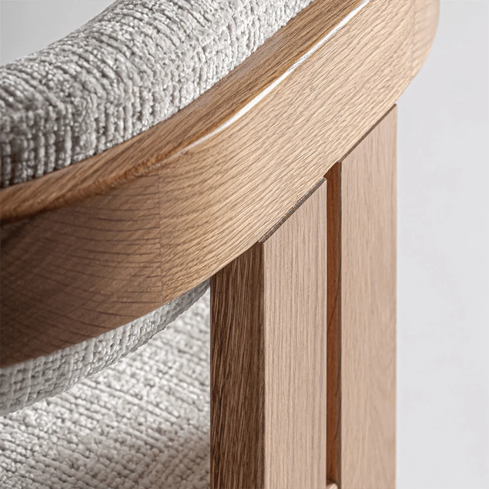 - O formato orgânico e aerodinâmico do encosto abraça subtilmente a silhueta, proporcionando conforto e resistência ao sentar, enquanto o estofamento do assento e da parte interna do encosto acrescenta suavidade e elegância.
