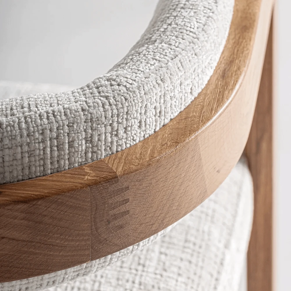 - A cadeira estofada Sedzere com encosto arredondado da marca Vical Home é uma peça de mobiliário única que combina a beleza natural da madeira com um design moderno e minimalista.