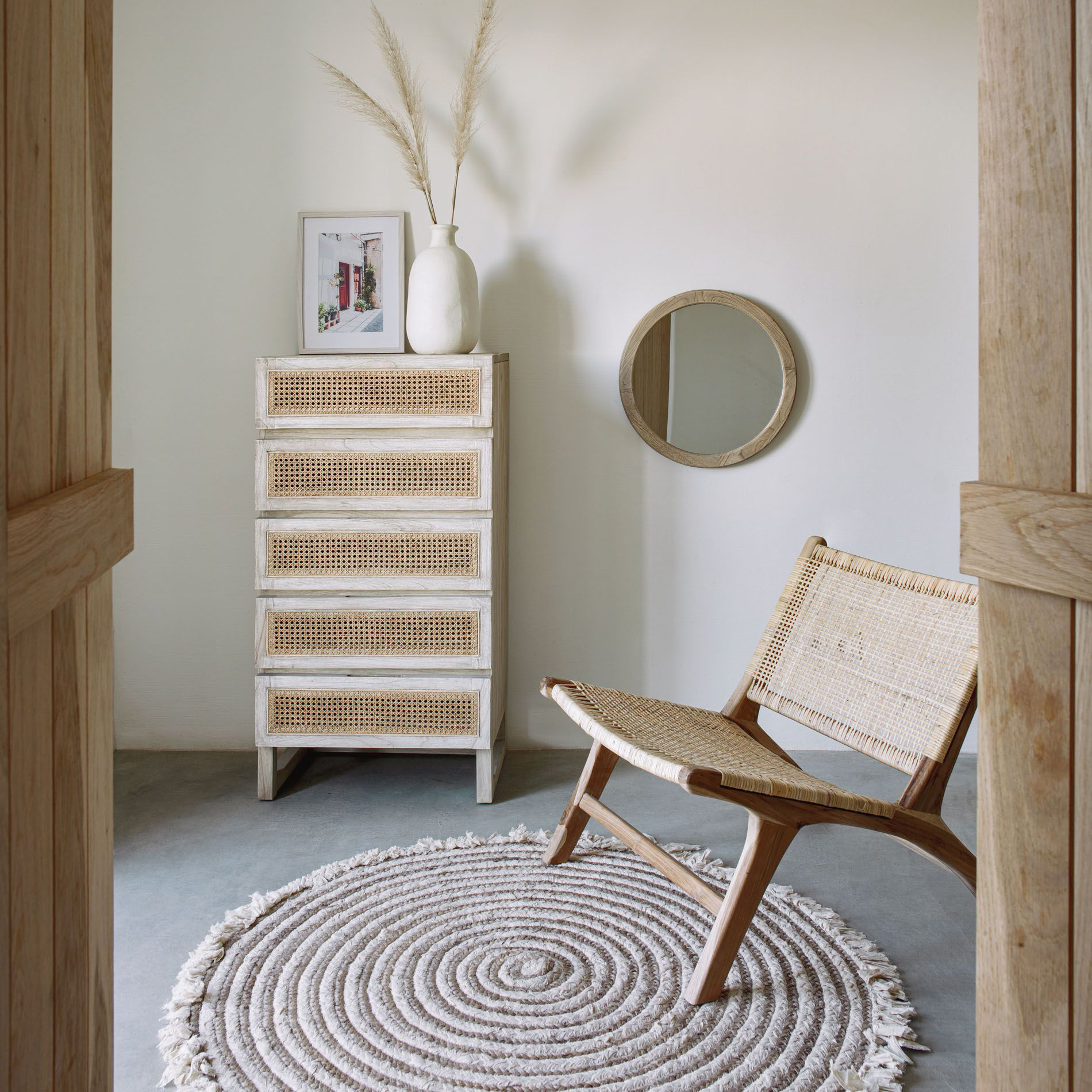 - Detalhes do material do encosto: Madeira de teca (Tectona grandis), Rattan