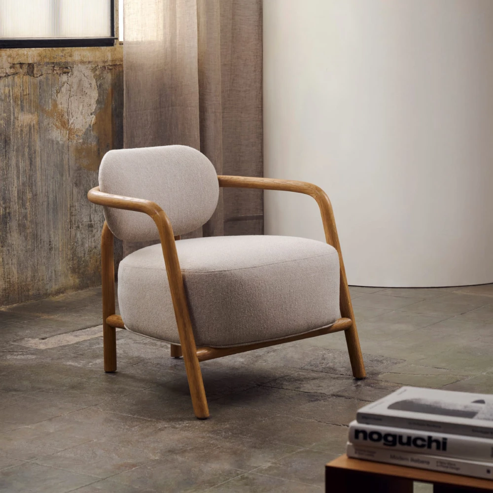 - A estrutura em madeira maciça de carvalho natural envolve o assento e o encosto de forma fluida, criando uma peça acolhedora e sofisticada.