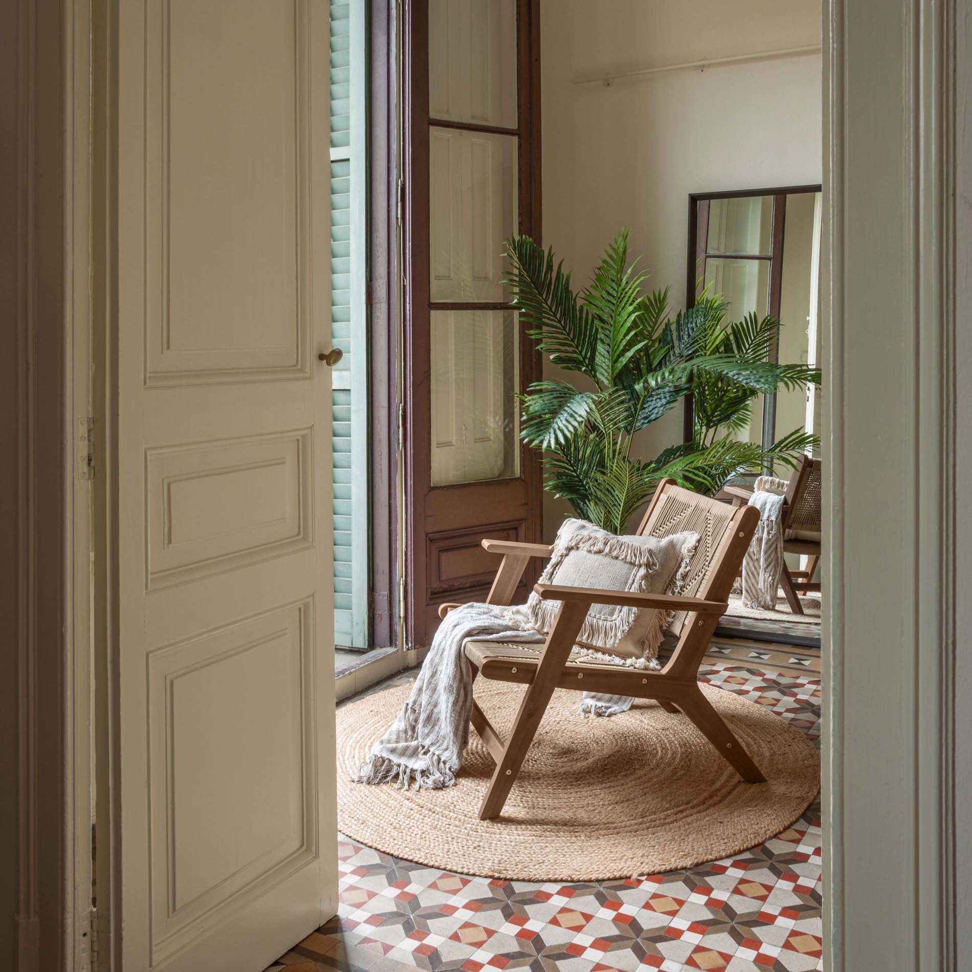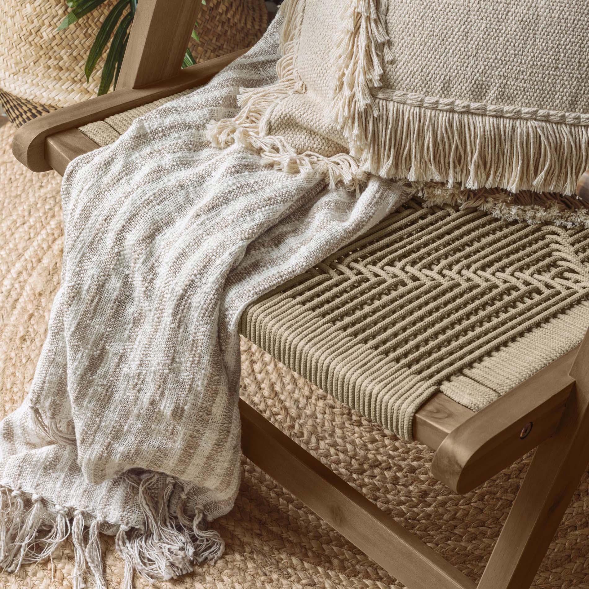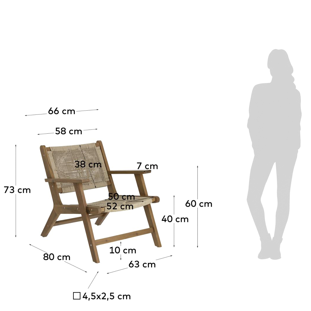 - Estrutura em madeira maciça de acácia com assento e encosto trançado à mão em corda poliéster.