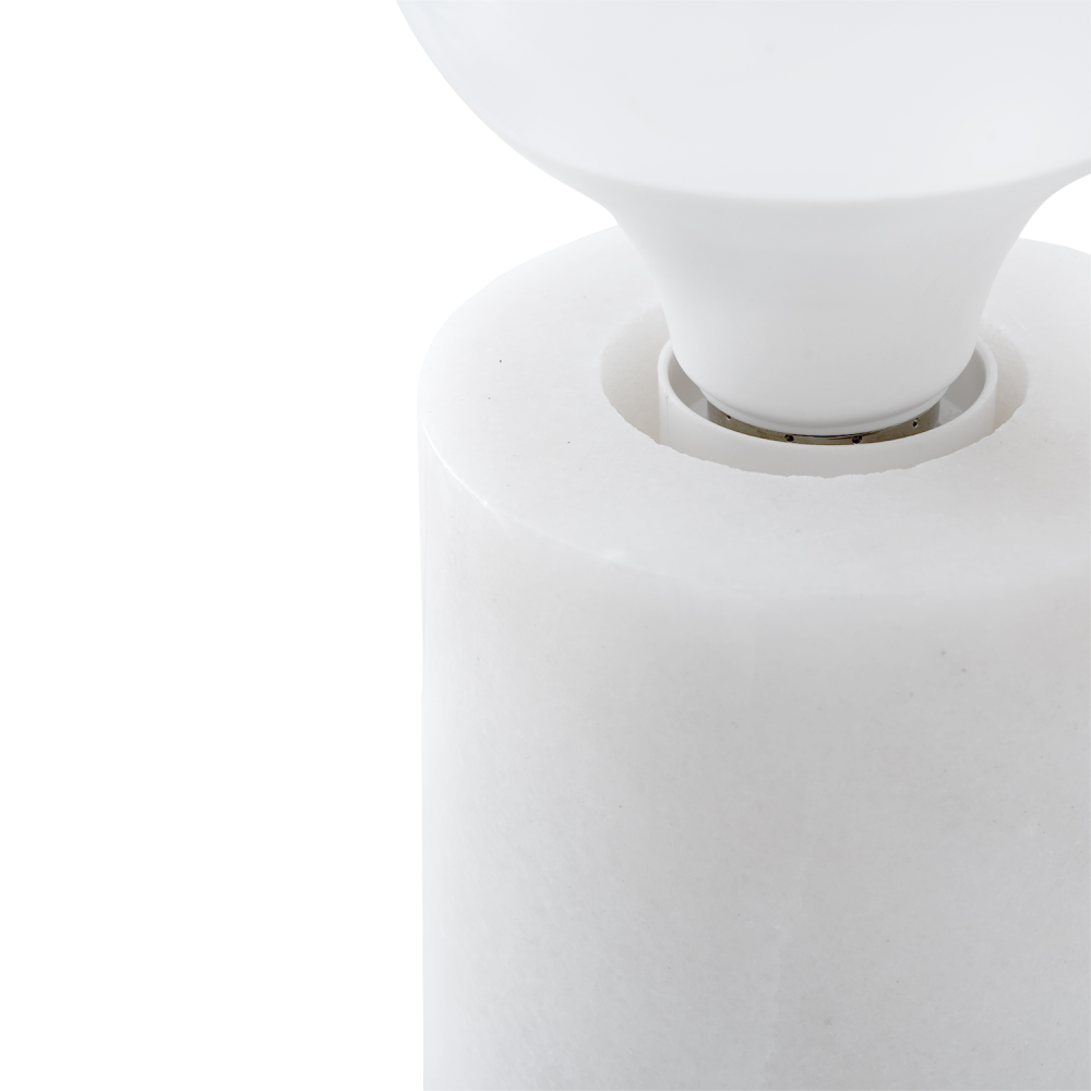 - Com base cilíndrica em mármore branco, o candeeiro de mesa Roser é uma peça compacta e sofisticada.