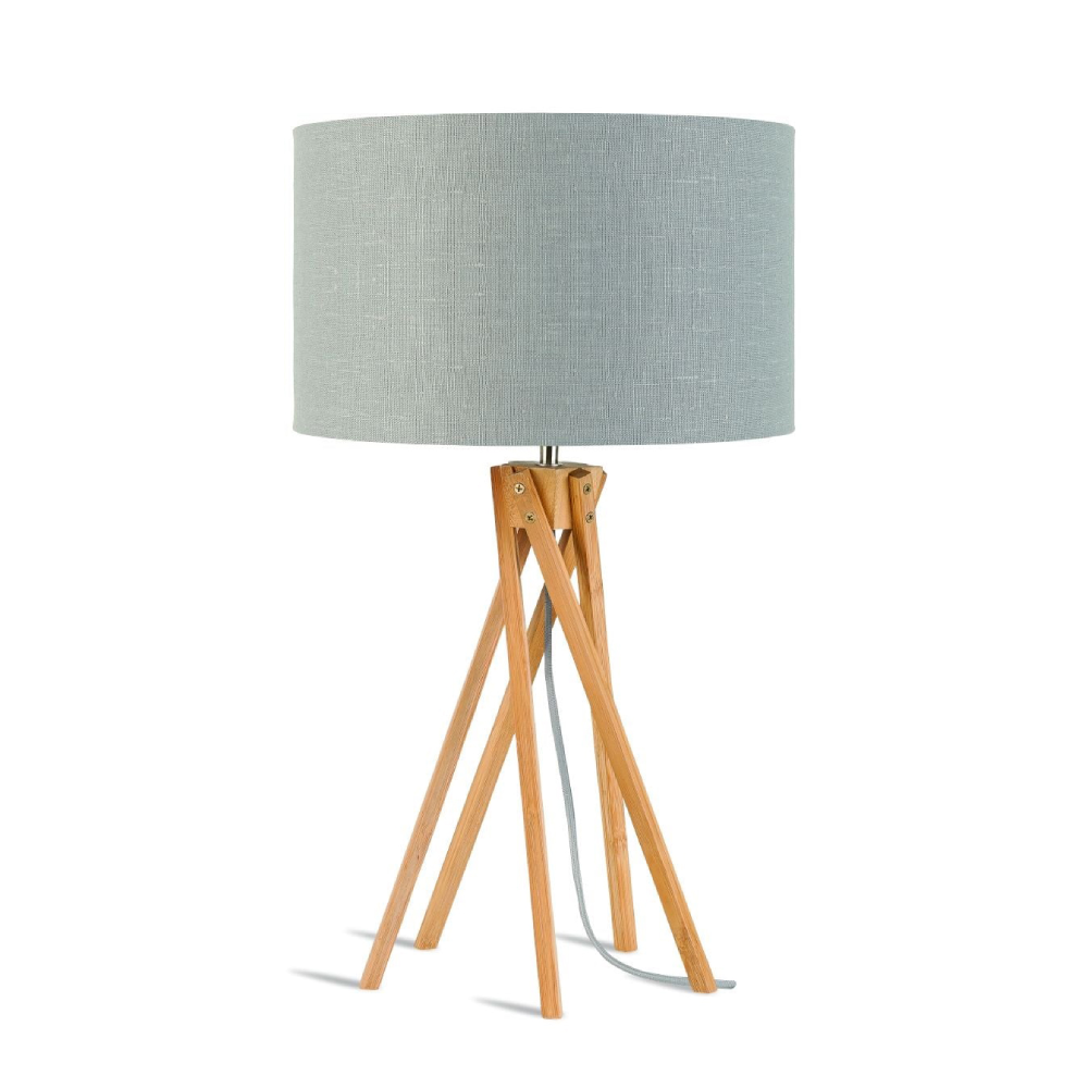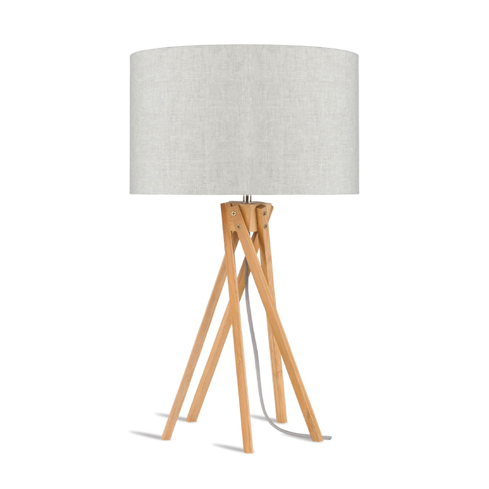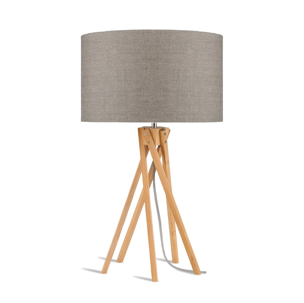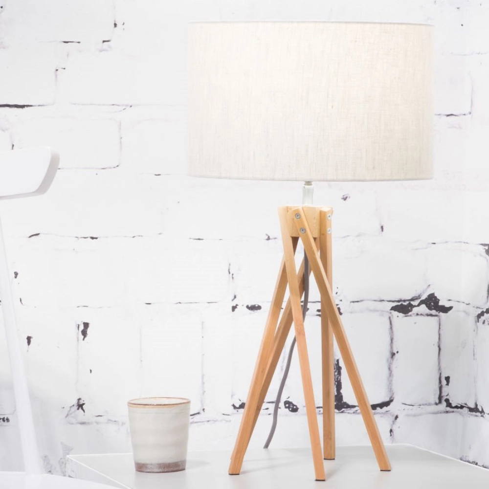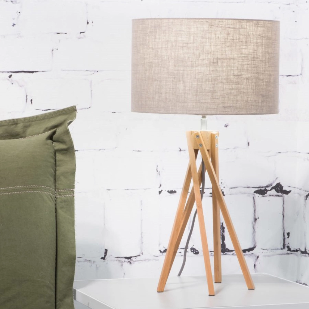 - O candeeiro de mesa Kilimanjaro destaca-se pelo contraste entre o abajur em linho cru e a base robusta em madeira bambu.