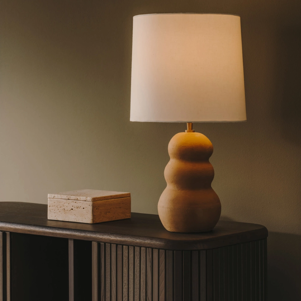 - Com base em terracota e abajur em tecido cru, o candeeiro de mesa Maden introduz calor e textura a qualquer ambiente.