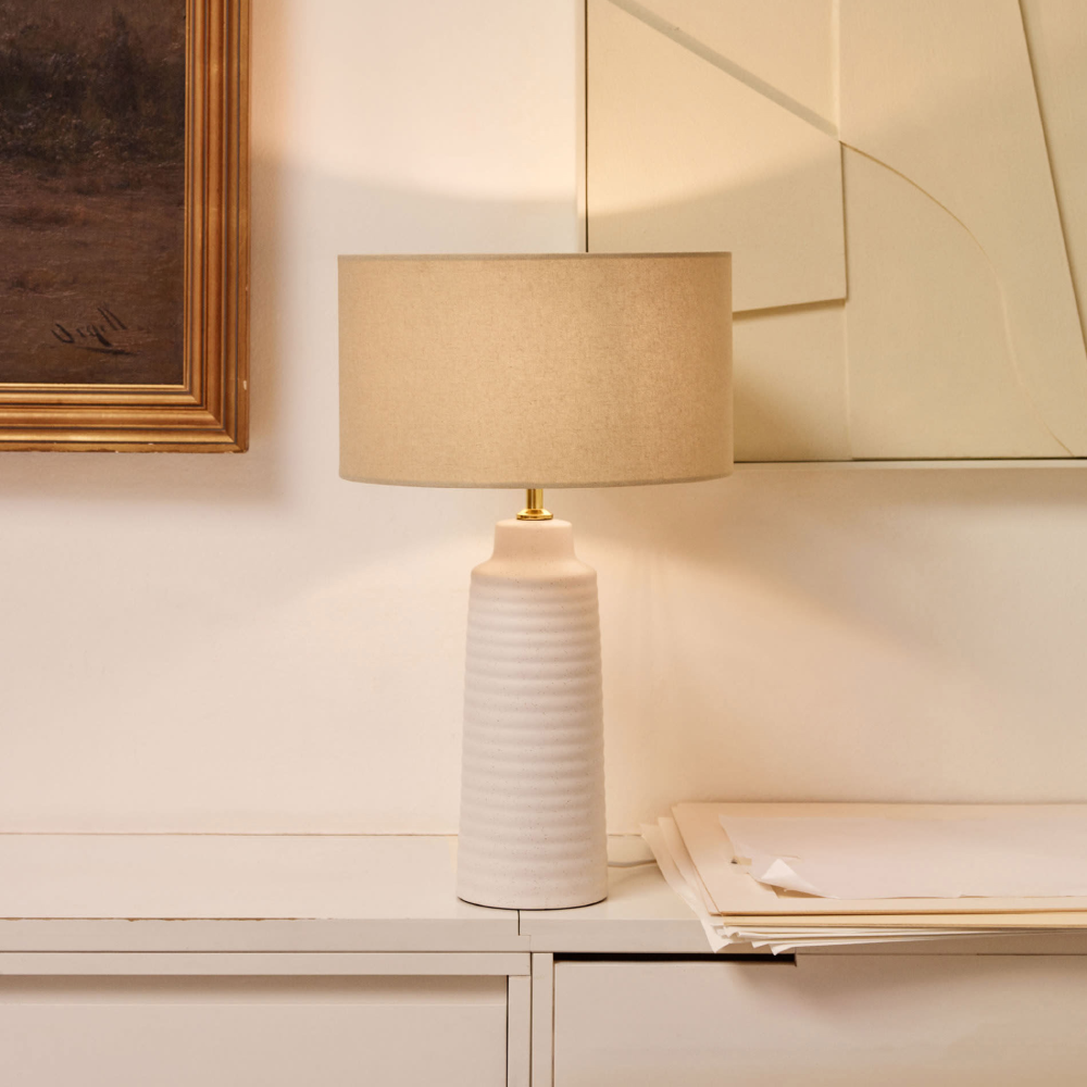 - Com uma base esculpida em cerâmica branca e abajur em linho com acabamento natural, o candeeiro de mesa Migal aposta num visual limpo, mas com textura e volume.