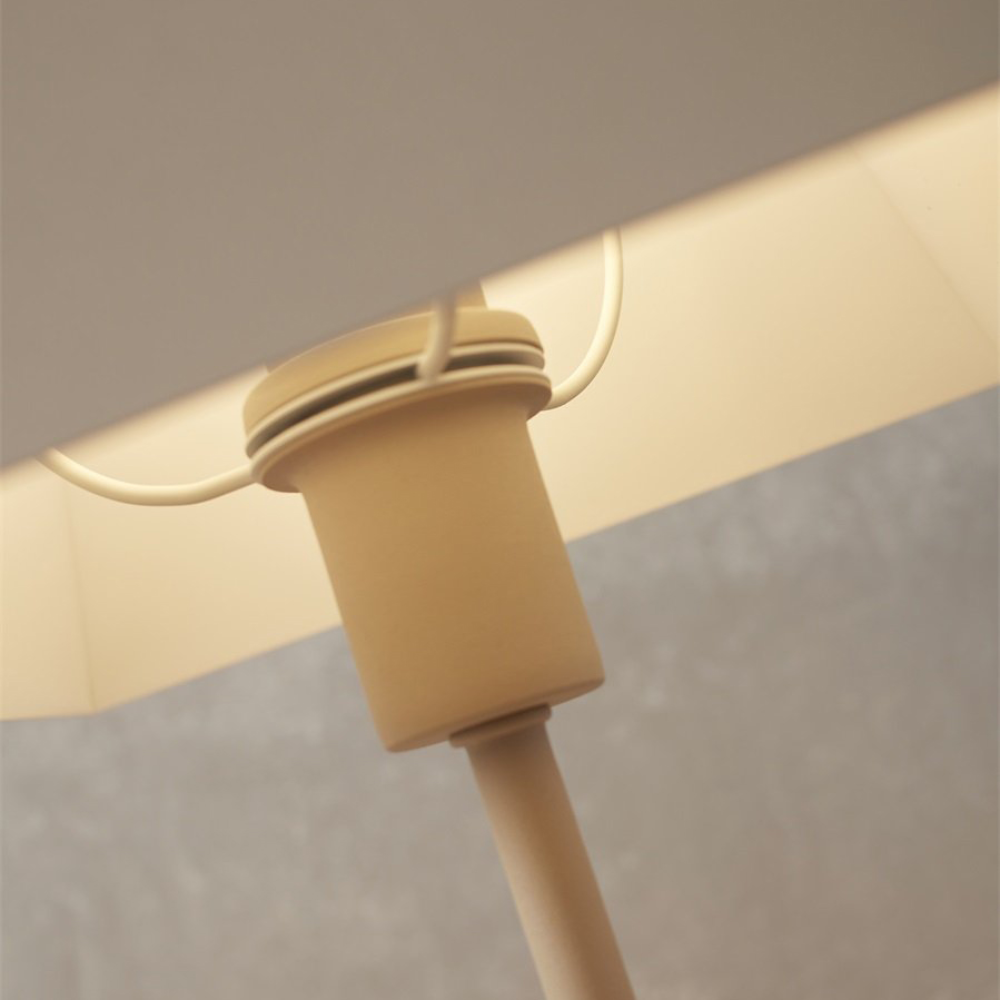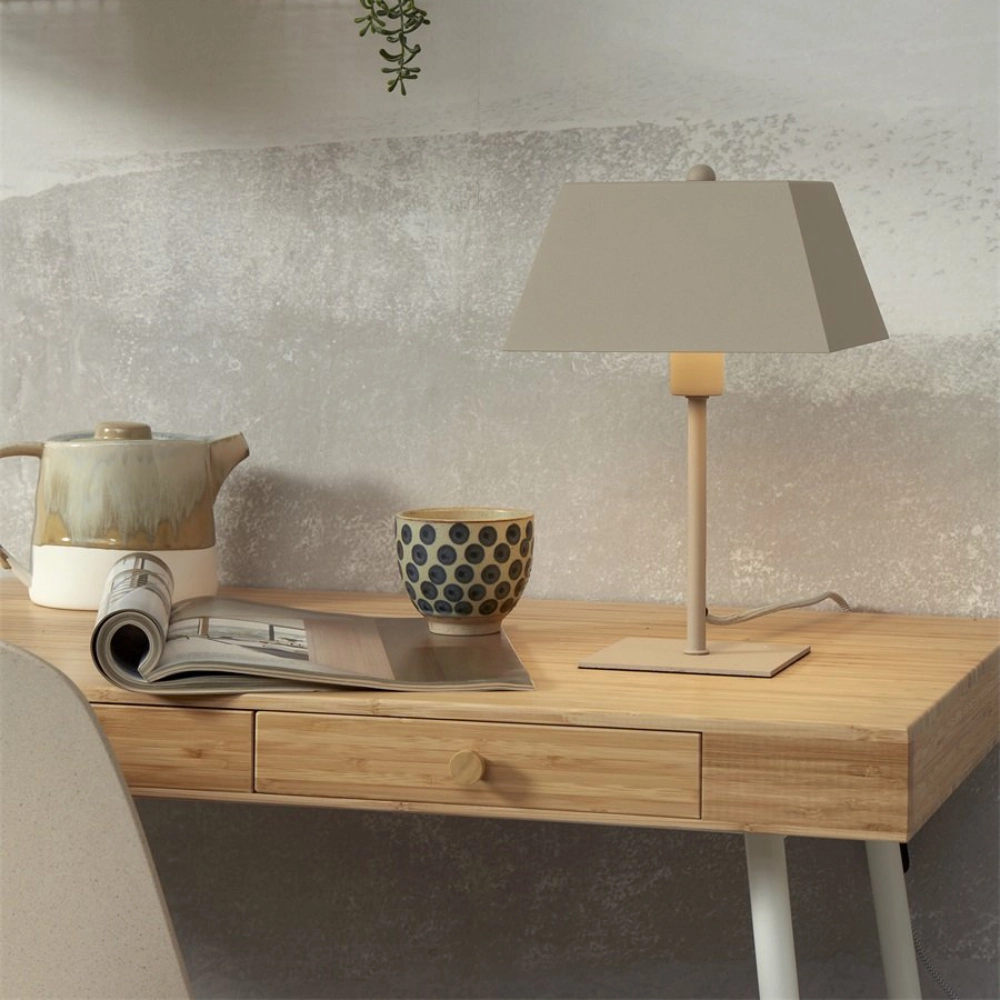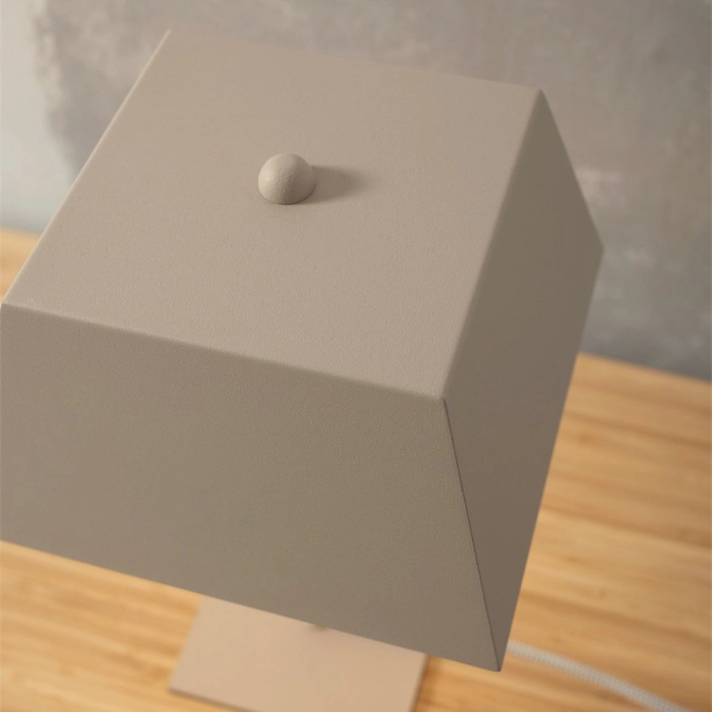 - O candeeiro Perth apresenta um design minimalista e moderno, com uma base quadrada e uma haste simples que sustenta um abajur de forma trapezoidal.