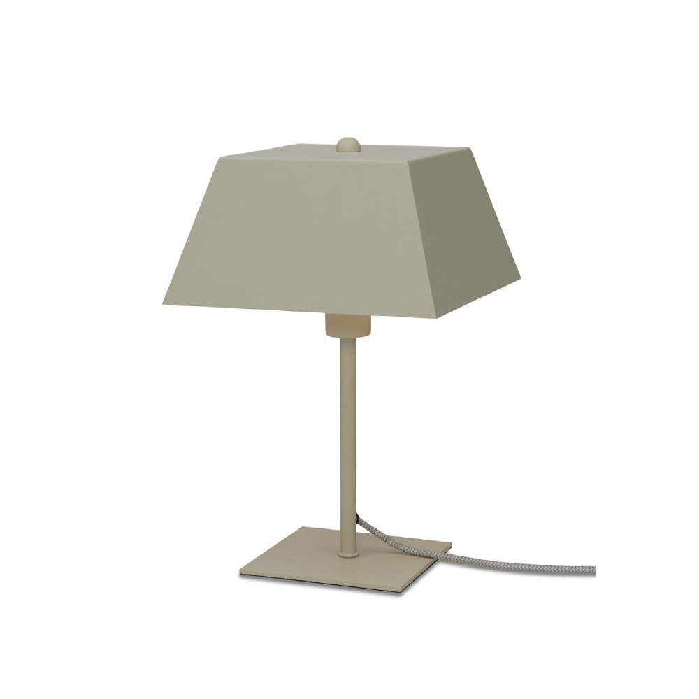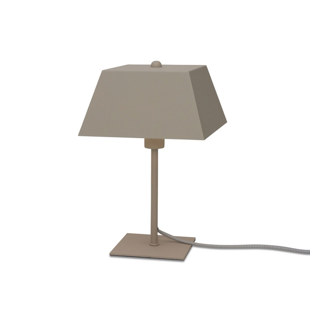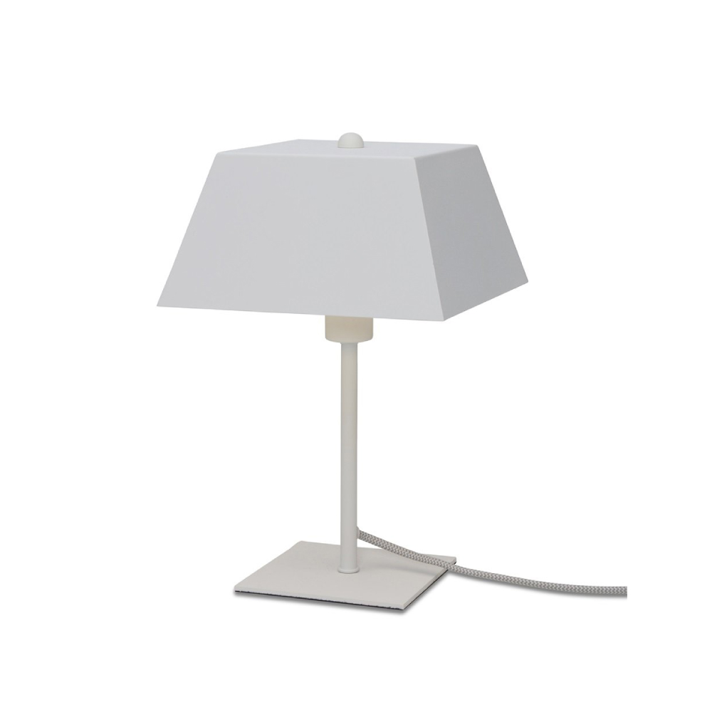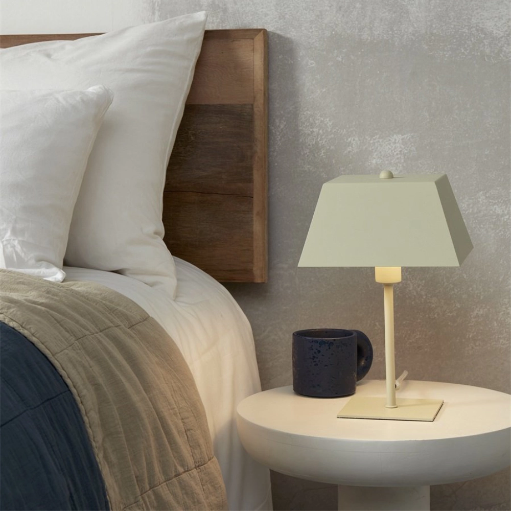 - O candeeiro Perth apresenta um design minimalista e moderno, com uma base quadrada e uma haste simples que sustenta um abajur de forma trapezoidal.