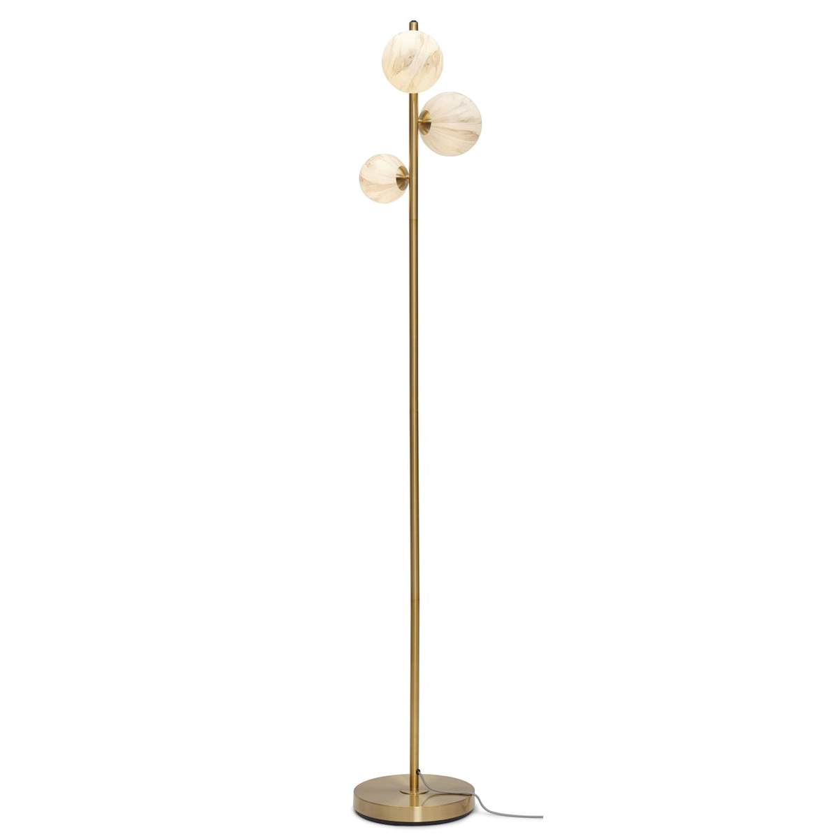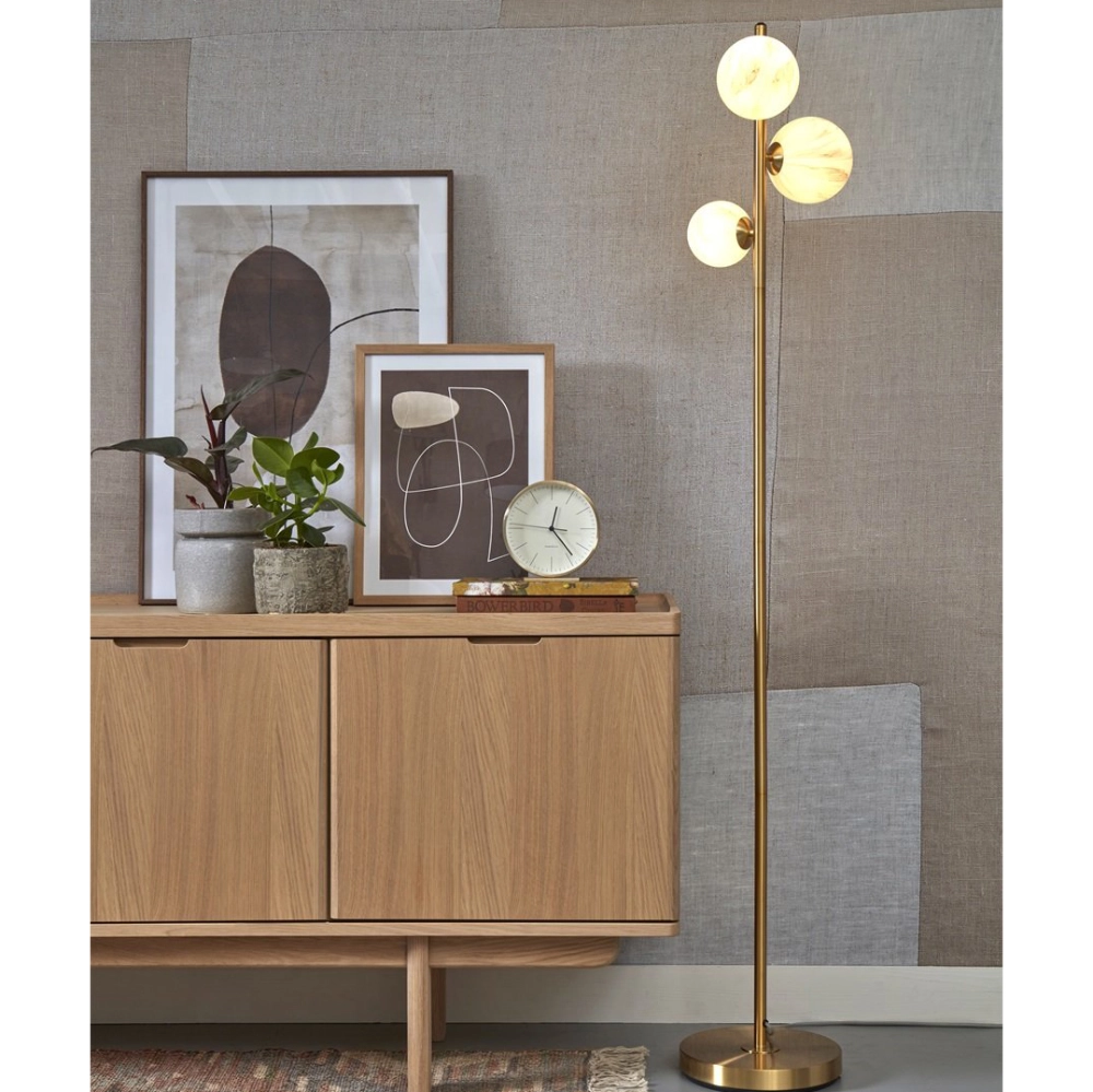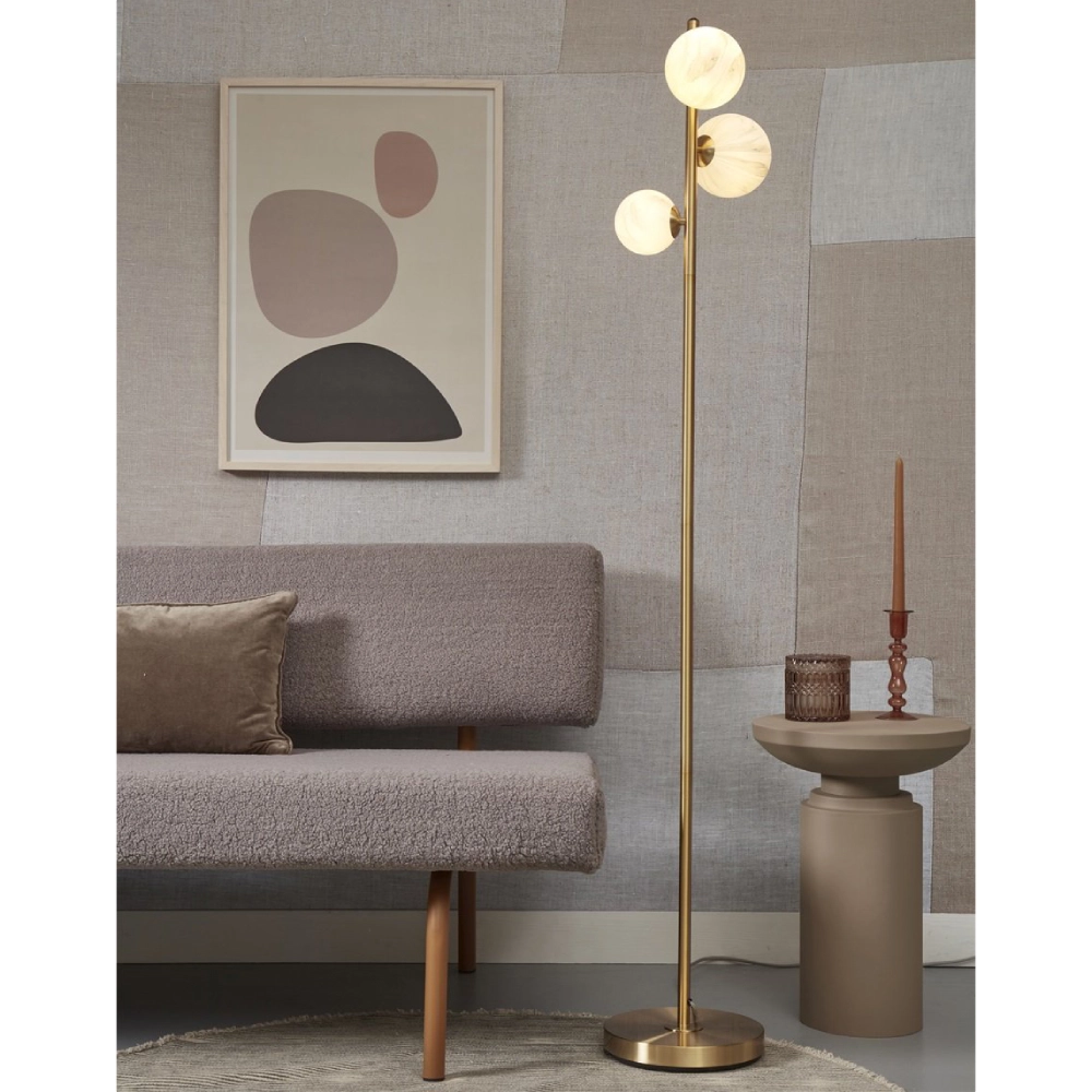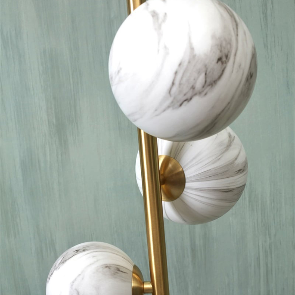 - O candeeiro de pé Carrara destaca-se pelos três globos de vidro com efeito mármore, dispostos de forma assimétrica numa estrutura metálica vertical.