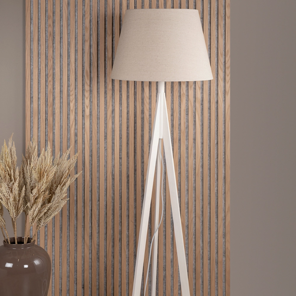 - Kuna é um candeeiro de pé com design simples feito em madeira de seringueira com acabamento branco mate.