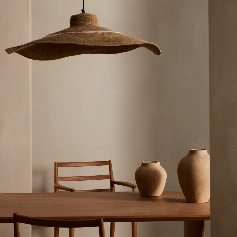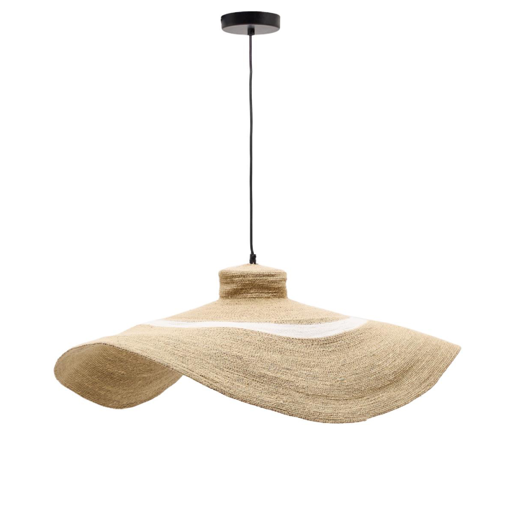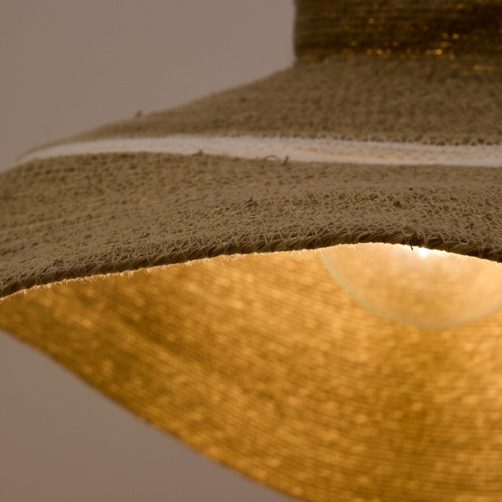 - Com um formato amplo e presença marcante, o candeeiro de teto Alban em juta natural (Ø90x20 cm) é ideal para ambientes espaçosos que pedem textura, conforto e um toque artesanal.