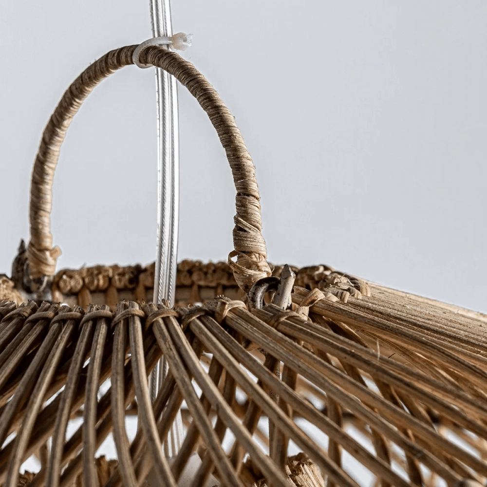- As curvas suaves e a textura natural do vime criam um jogo de luz e sombra fascinante, proporcionando uma iluminação ambiente suave e convidativa.