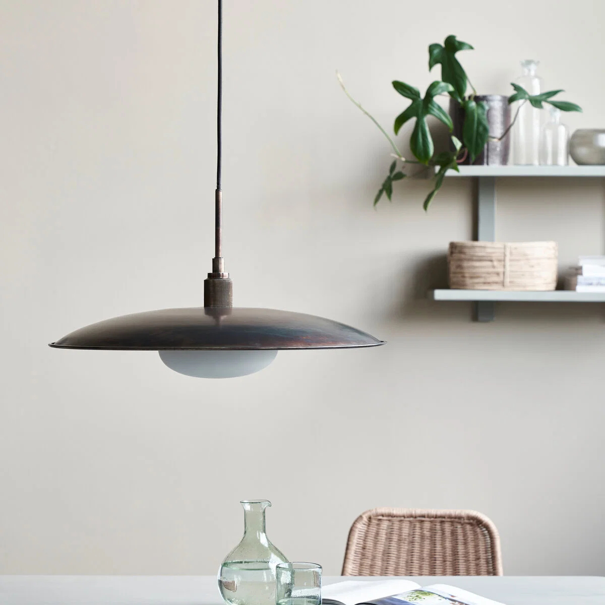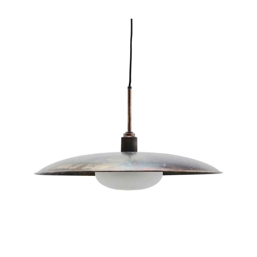 - Candeeiro de teto em metal com acabamento em tom envelhecido, pensado para criar uma iluminação equilibrada sobre mesas de jantar ou zonas de estar.