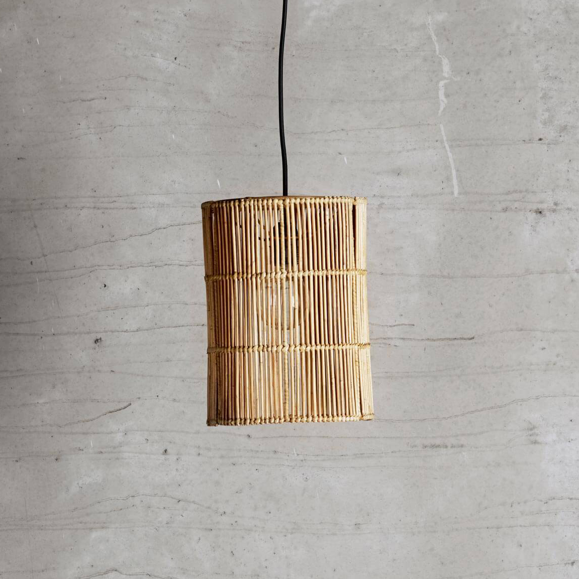 - Abajur em rattan natural entrançado com formato cilíndrico compacto, ideal para criar pontos de luz mais discretos e acolhedores.