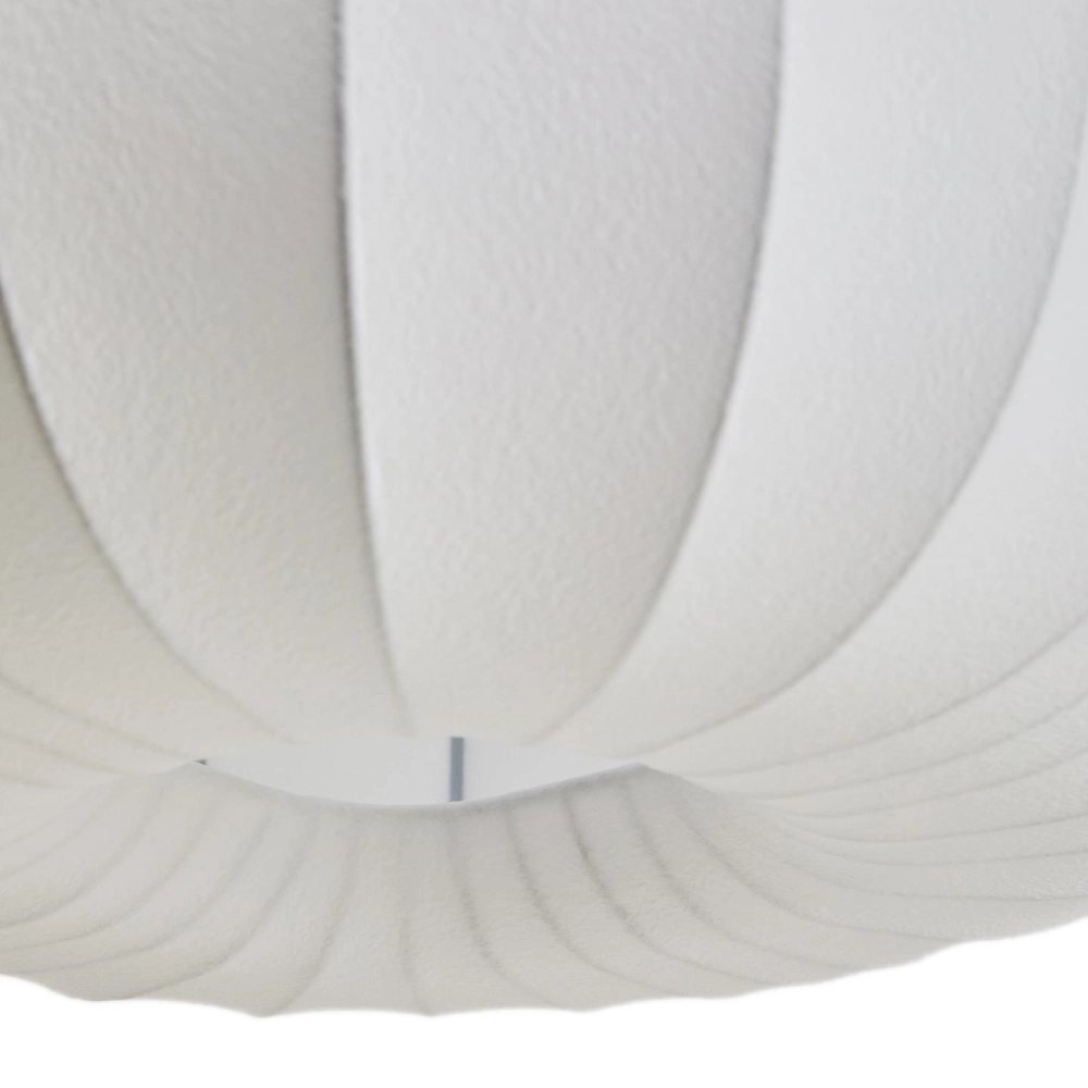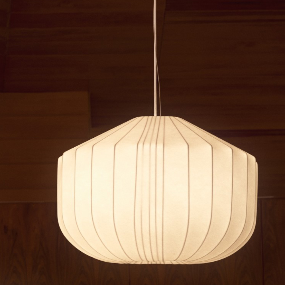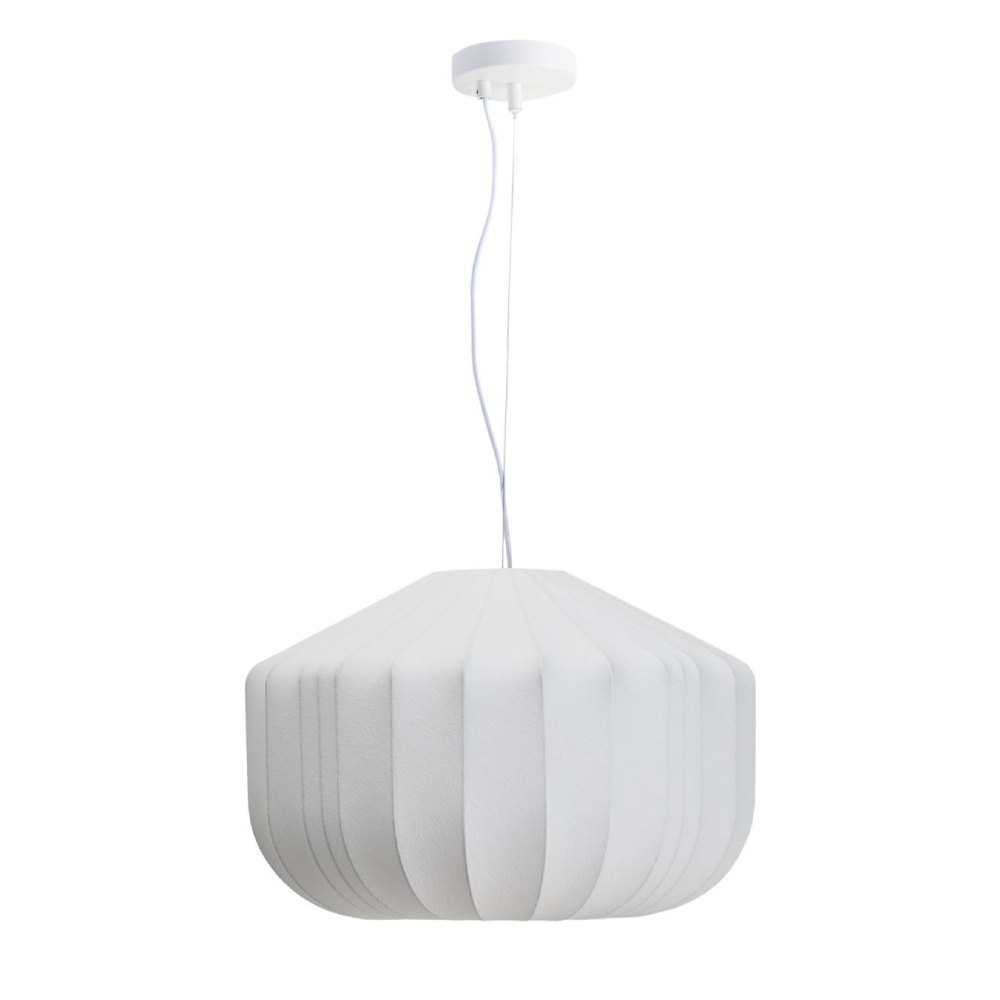 - O candeeiro suspenso Somaran distingue-se pela sua forma escultórica e acabamento em seda branca, que confere leveza e elegância ao ambiente.