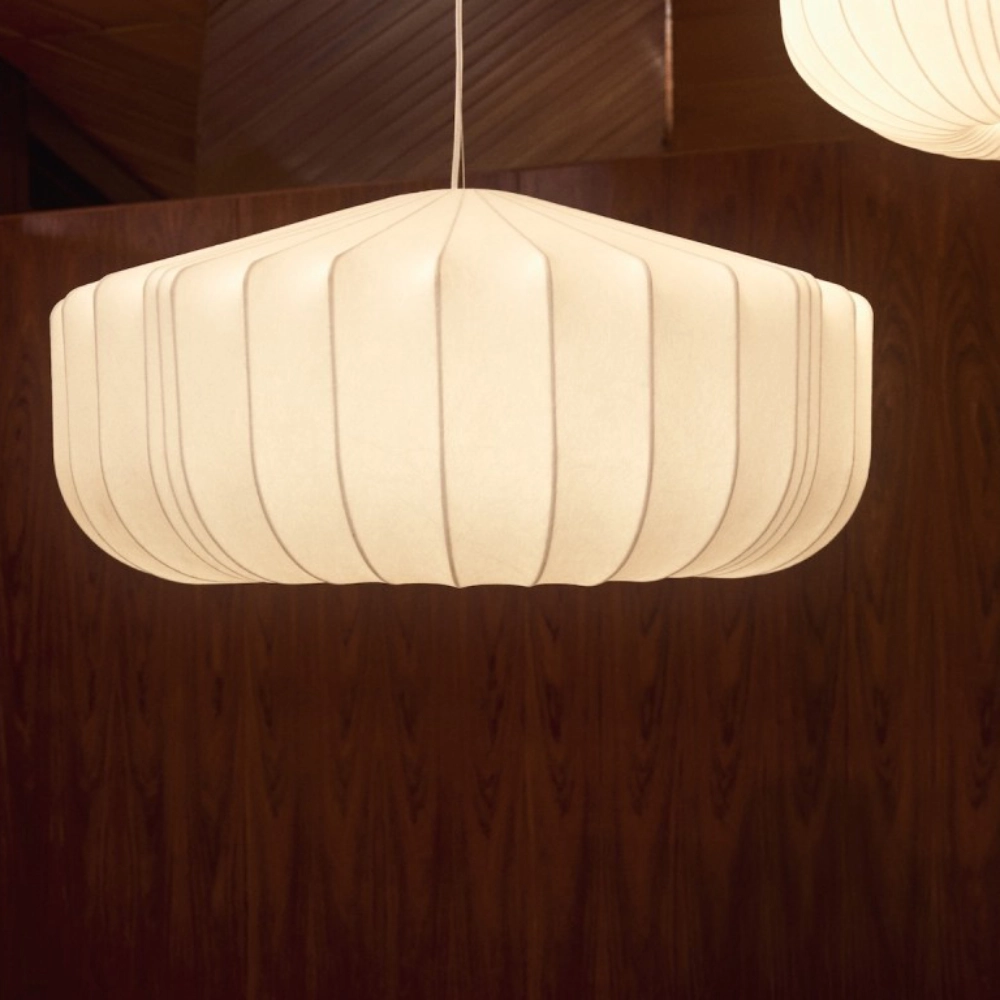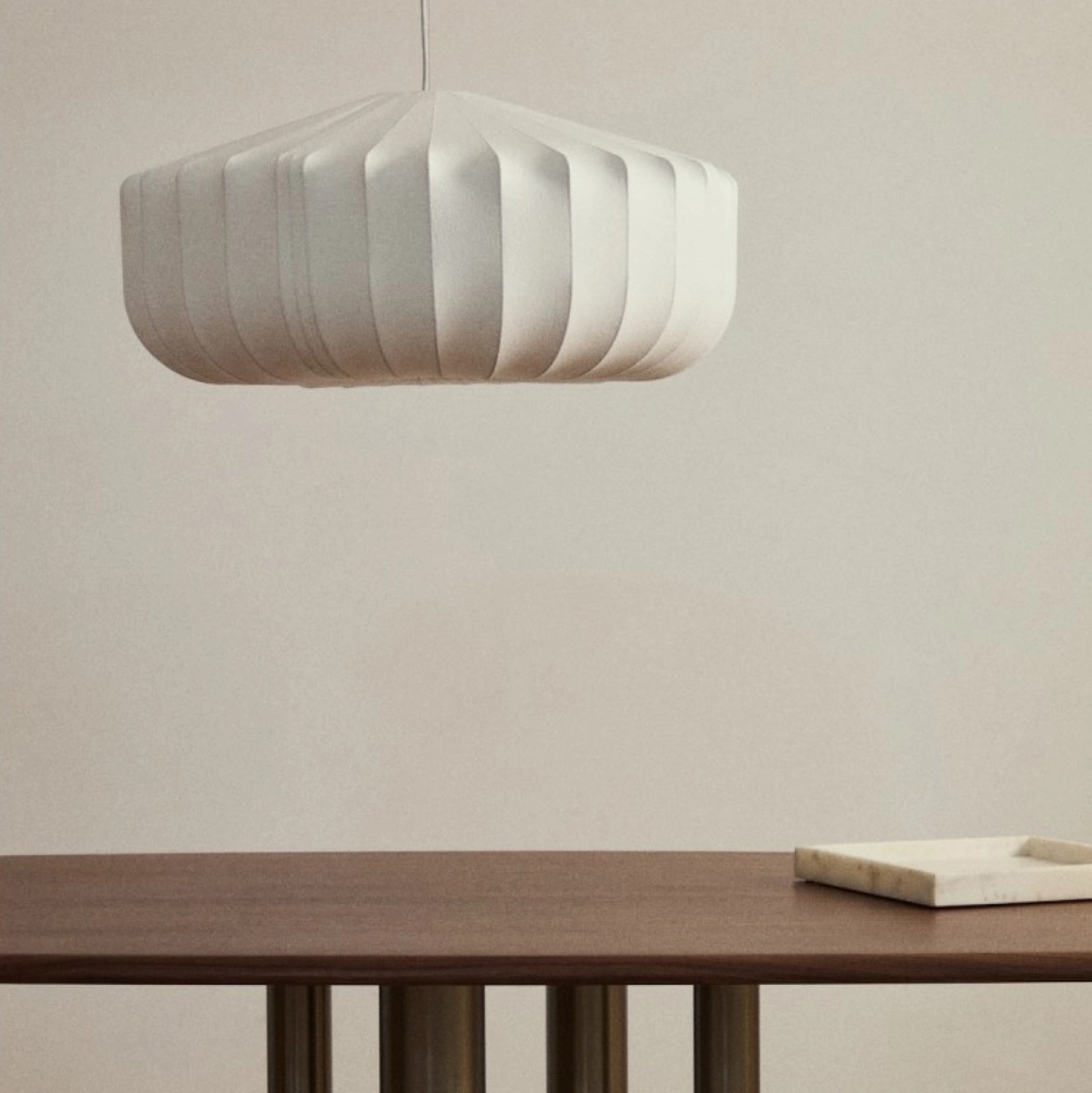 - O candeeiro suspenso Somaran apresenta um design orgânico e elegante, com abajur em seda branca que difunde a luz de forma suave e uniforme.