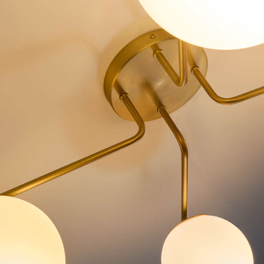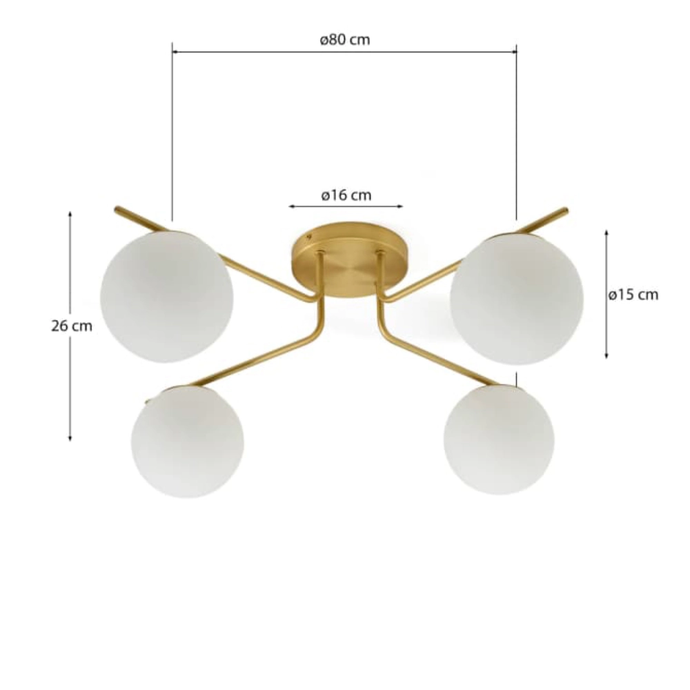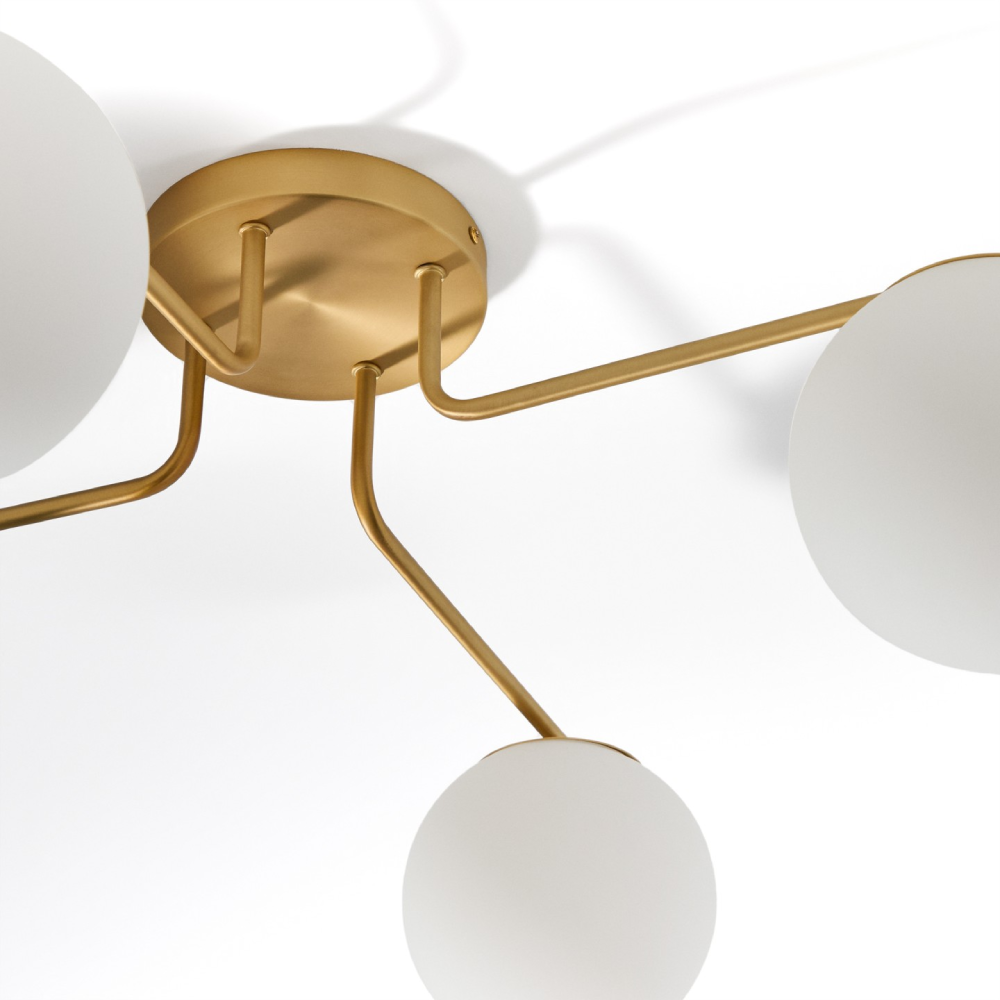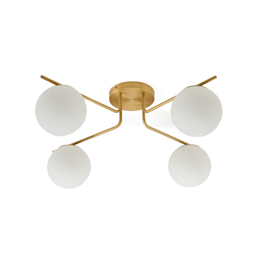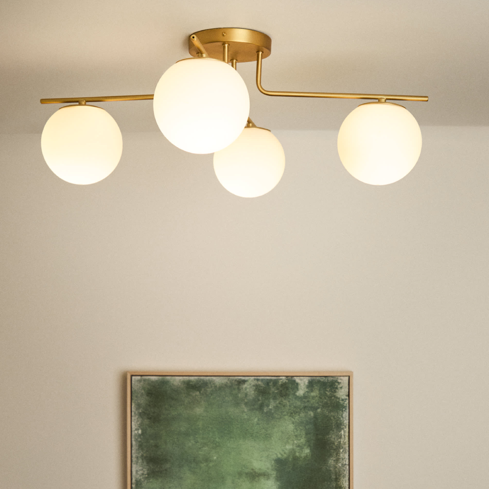 - A estrutura em metal dourado escovado contrasta com os quatro globos em vidro fosco, que difundem a luz de forma uniforme e suave.