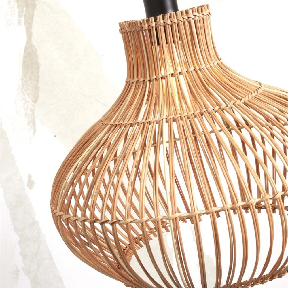- O candeeiro de teto Kalahari destaca-se pela sua forma generosa e pelo trançado em rattan natural, que confere textura e leveza ao ambiente.