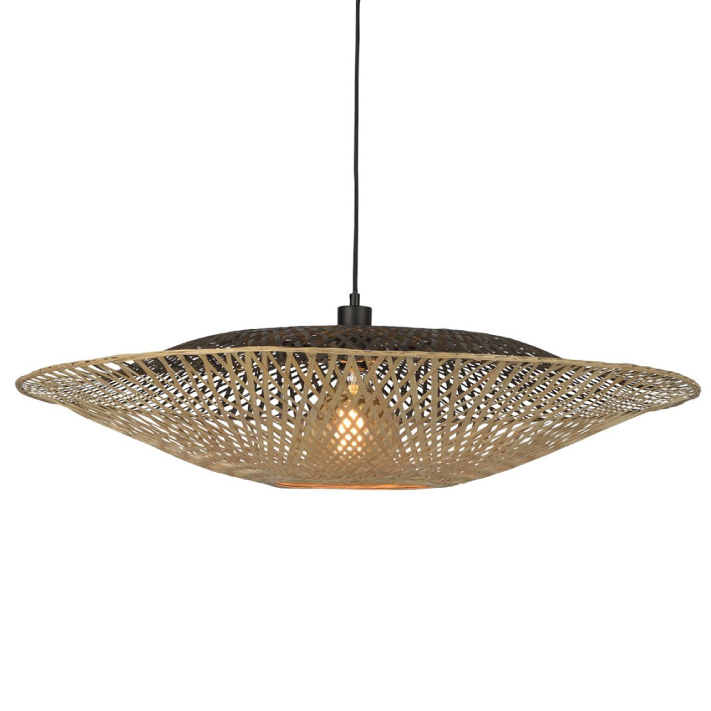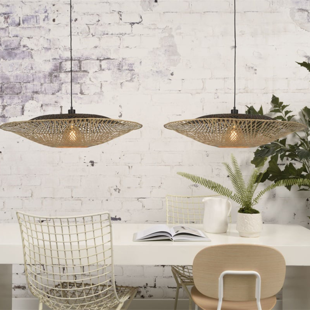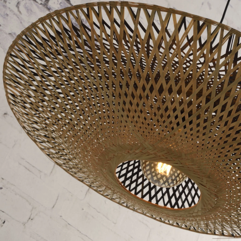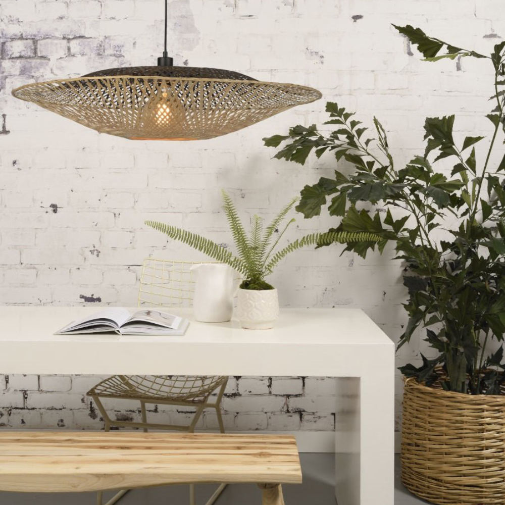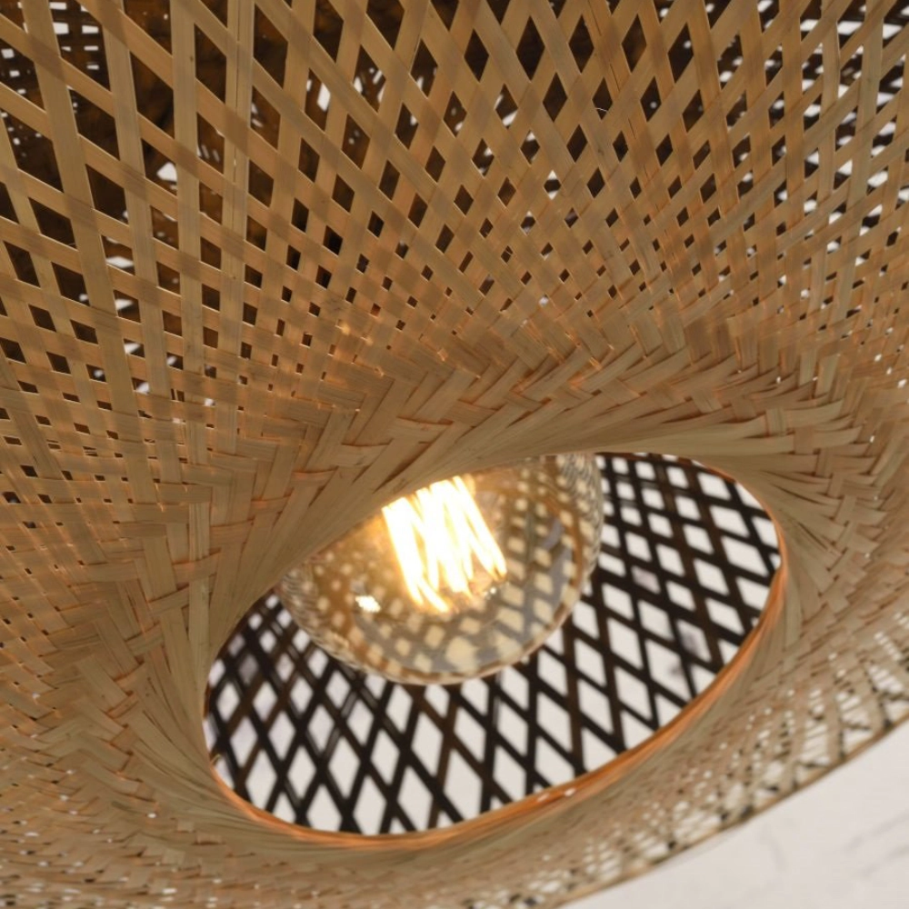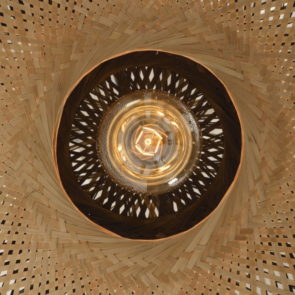 - O candeeiro de teto Kalimantan destaca-se pela sua forma arredondada e estrutura em bambu natural, entrançada à mão.