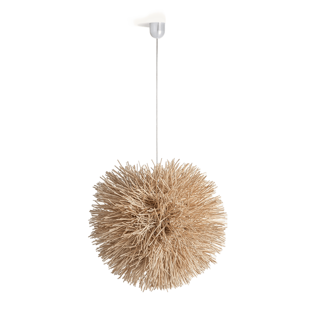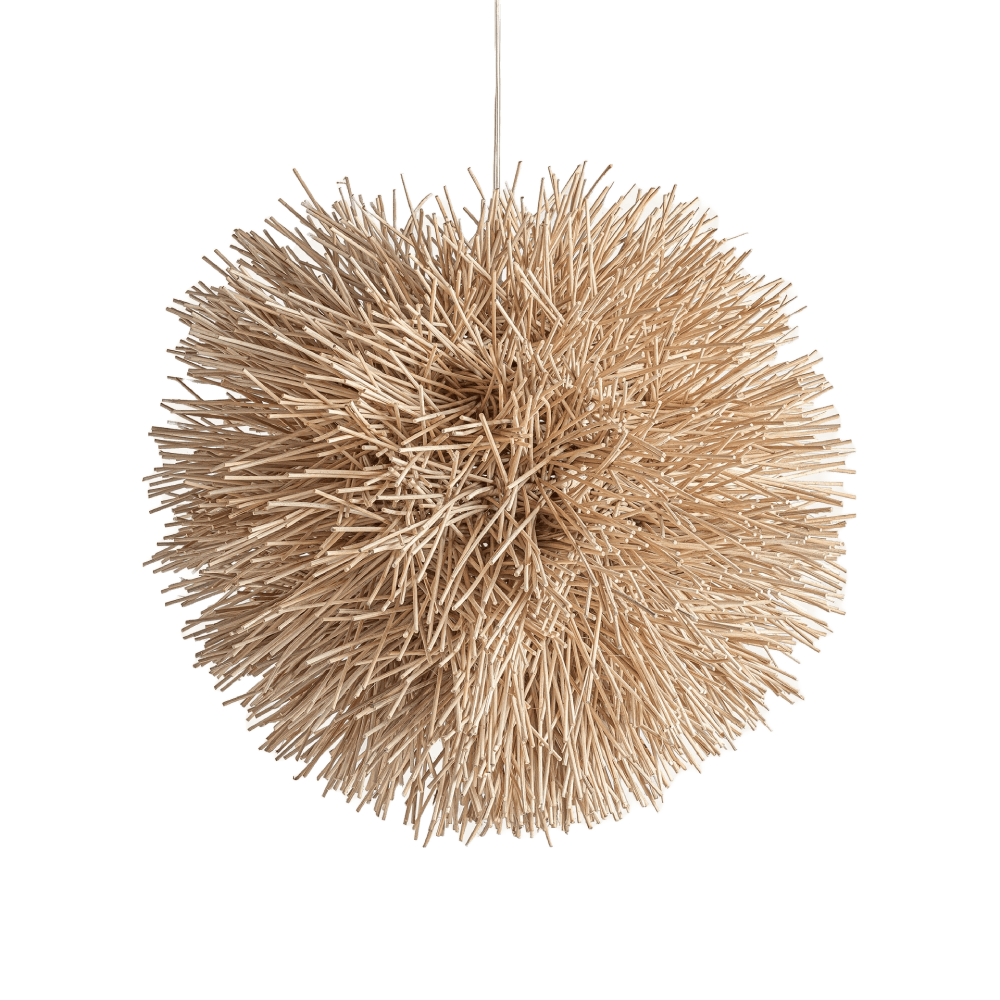 - Feito em rattan natural, apresenta uma forma orgânica e volumosa que remete à leveza da natureza, criando um efeito visual impressionante mesmo quando desligado.