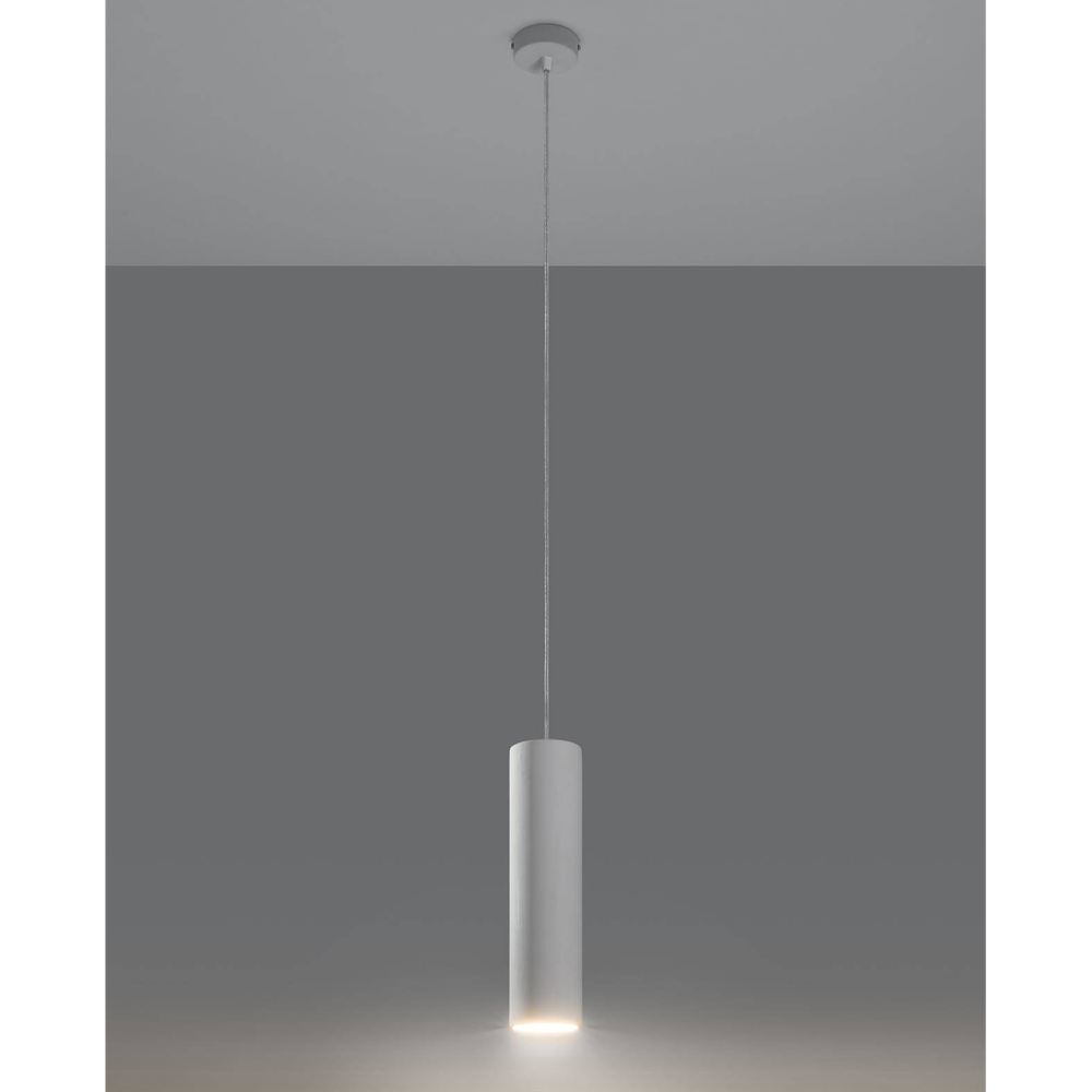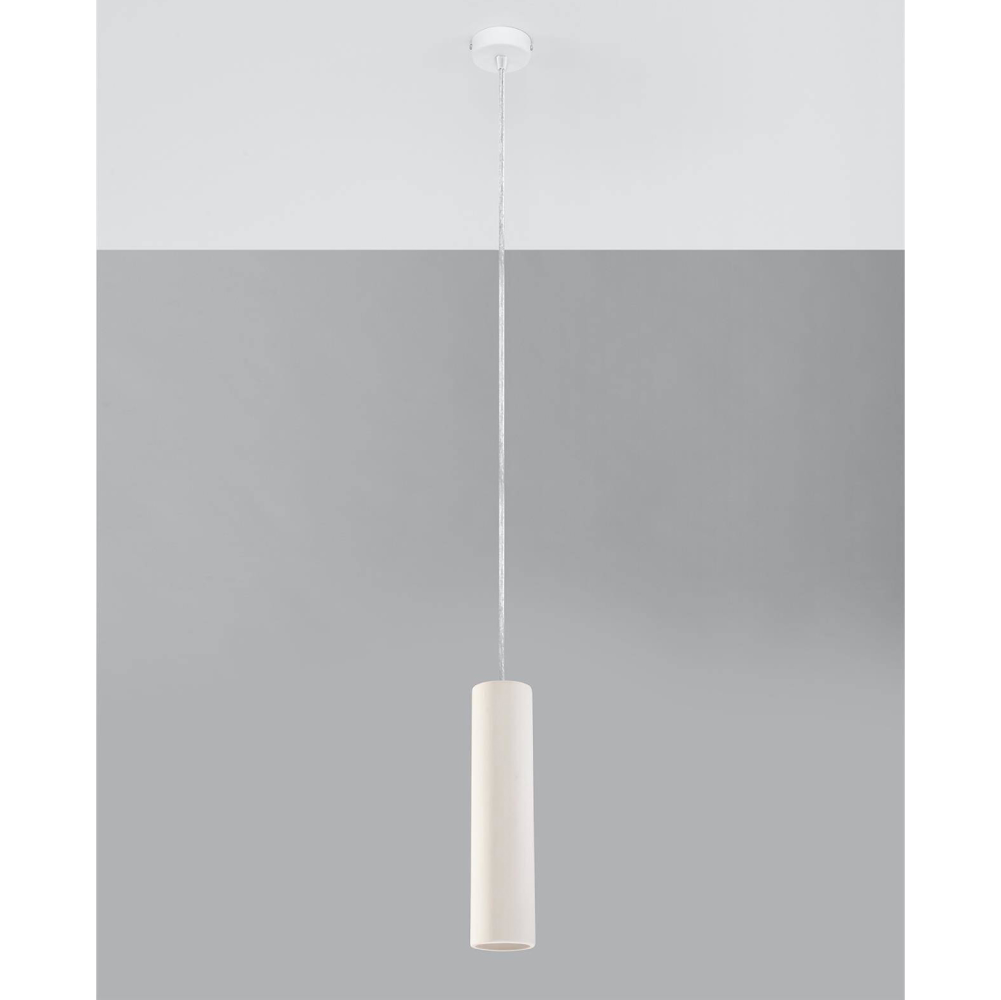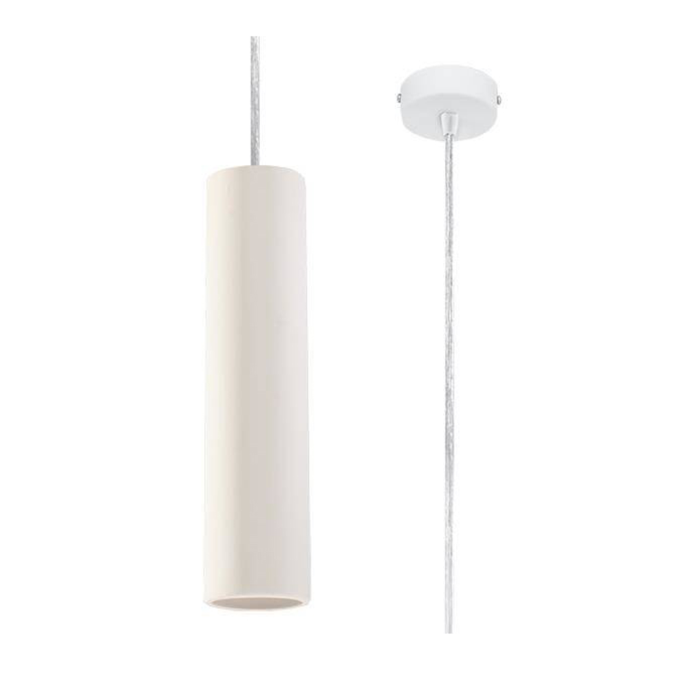 - O candeeiro suspenso Nanci, com 8 cm de diâmetro e 32 cm de altura, apresenta um perfil estreito e elegante em cerâmica branca mate.