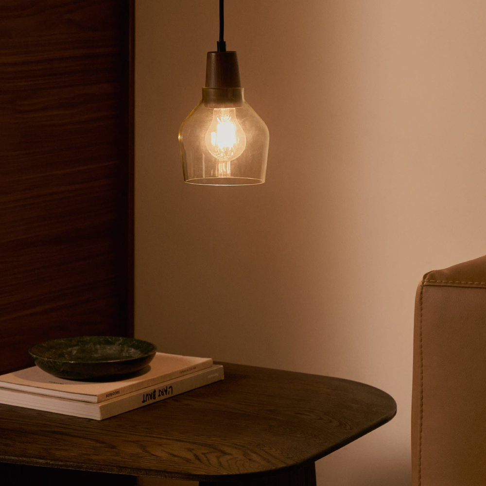 - O candeeiro Sille tem um design sóbrio que combina a pureza do vidro verde com a naturalidade da madeira nogueira.