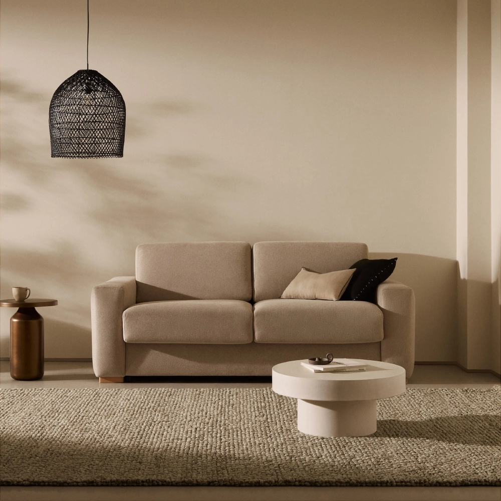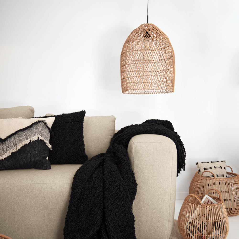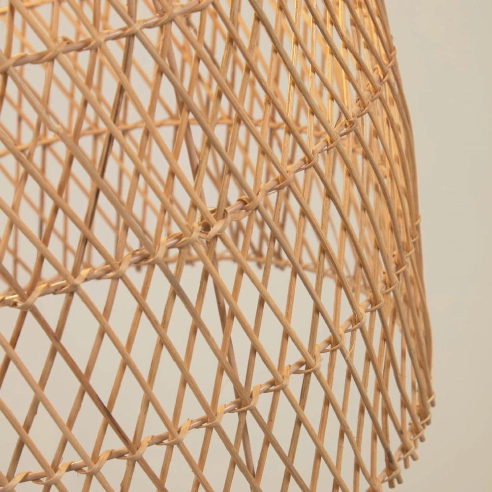 - O candeeiro suspenso Tommi apresenta uma forma alongada em rattan natural, com entrançado artesanal que projeta uma luz envolvente e cheia de textura.