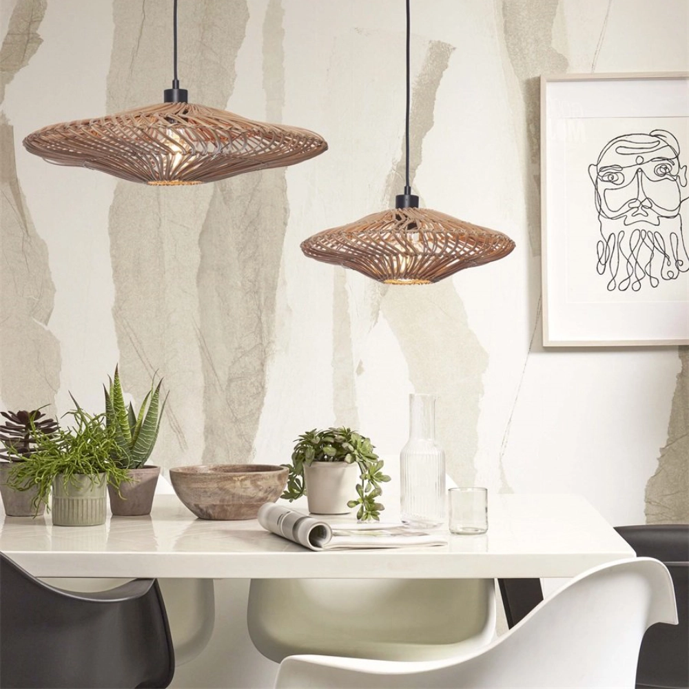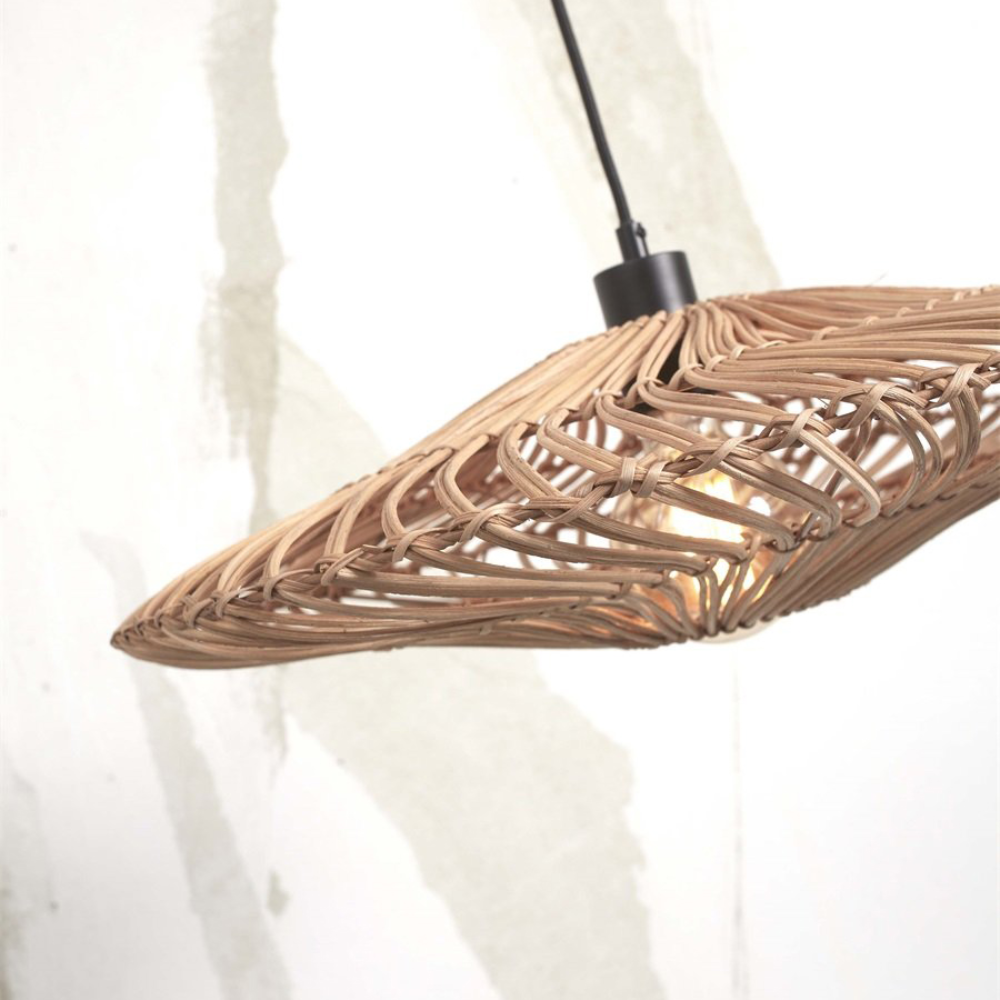- O candeeiro de teto Zanzibar apresenta uma forma elegante e alongada, com estrutura em rattan natural entrançado que projeta uma luz quente e texturada.