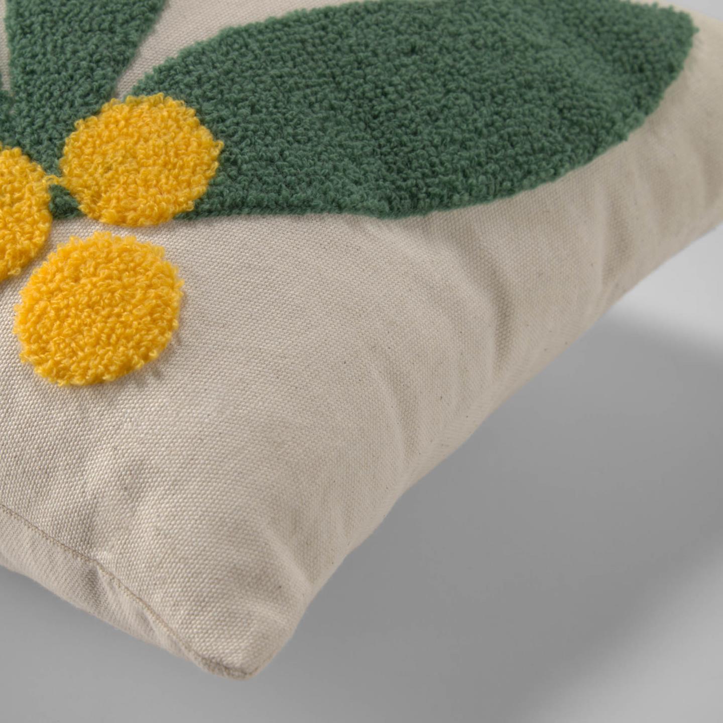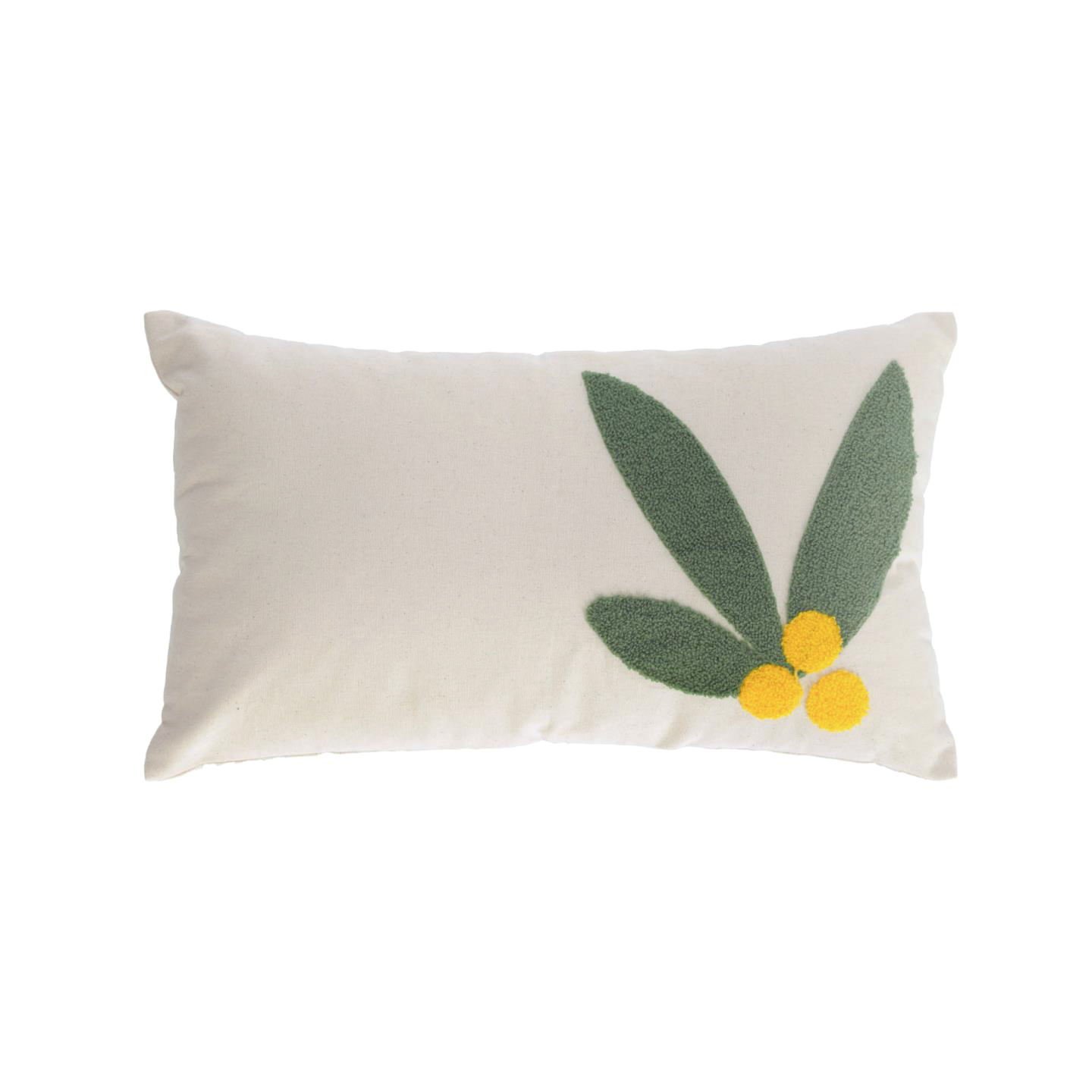 Travesseiro retangular branco com decoração em folhas verdes e flores amarelas