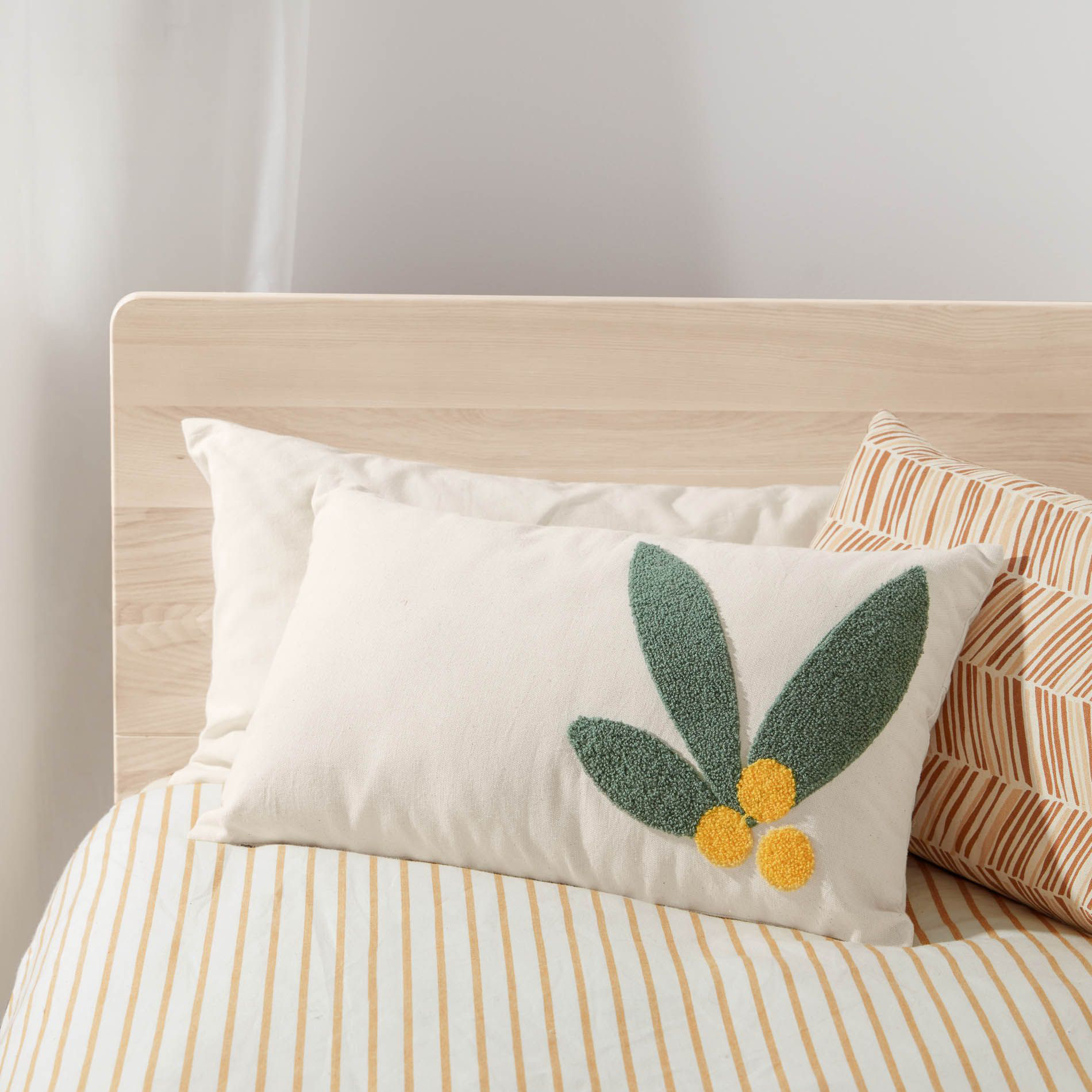 • Almofada branca bordada com folhas verdes e círculos amarelos numa cama com roupa riscada amarela e almofadas riscas laranja