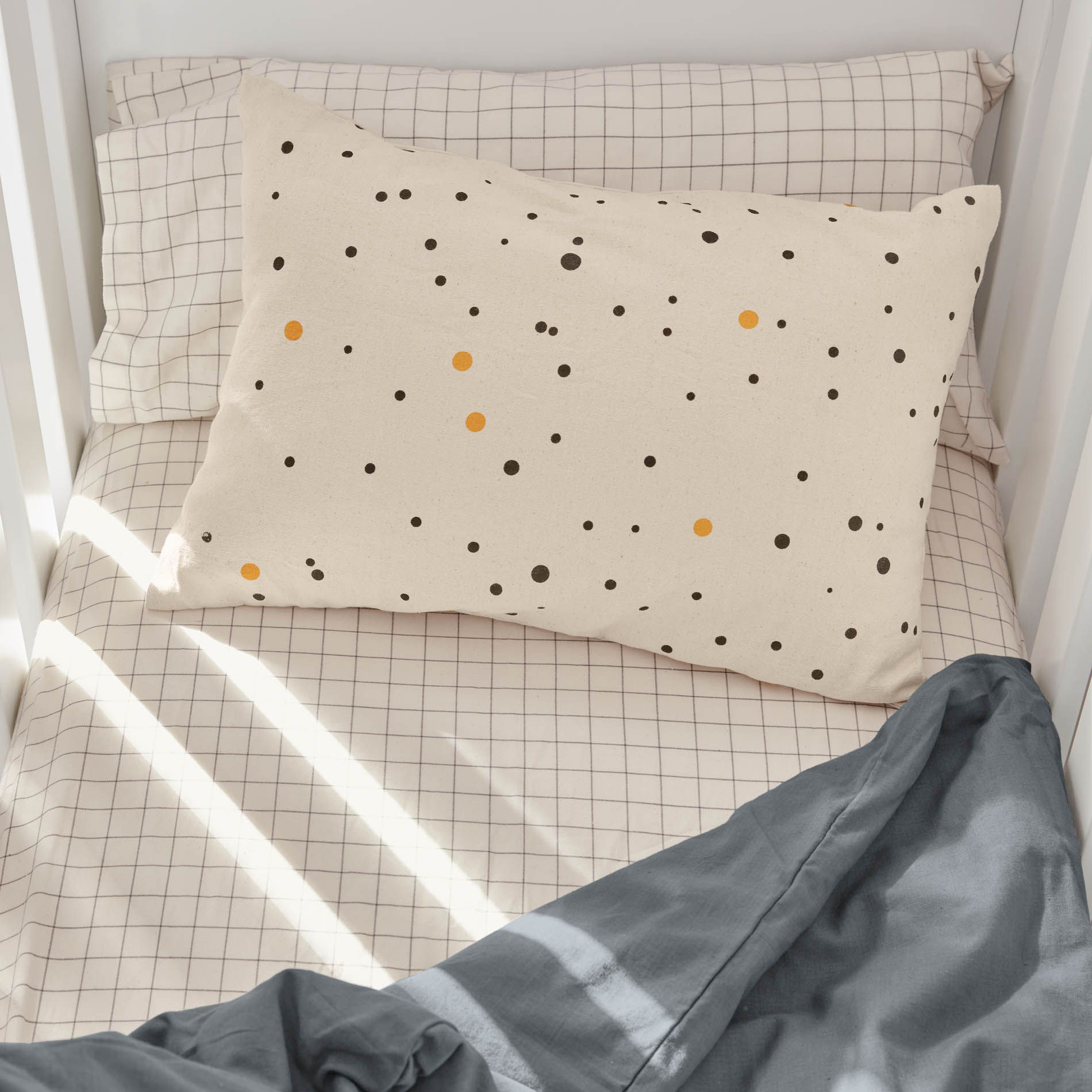 • Travesseiro retangular bege com bolinhas pretas e amarelas.