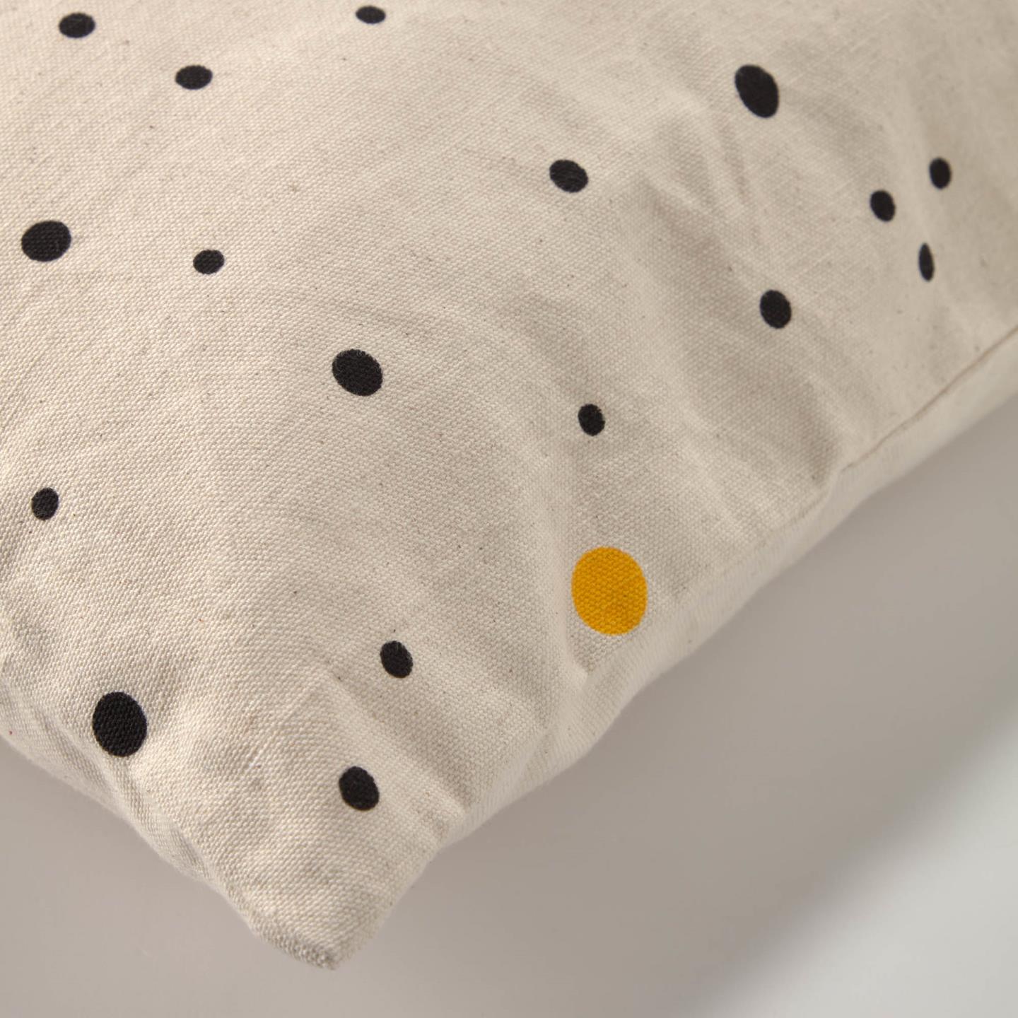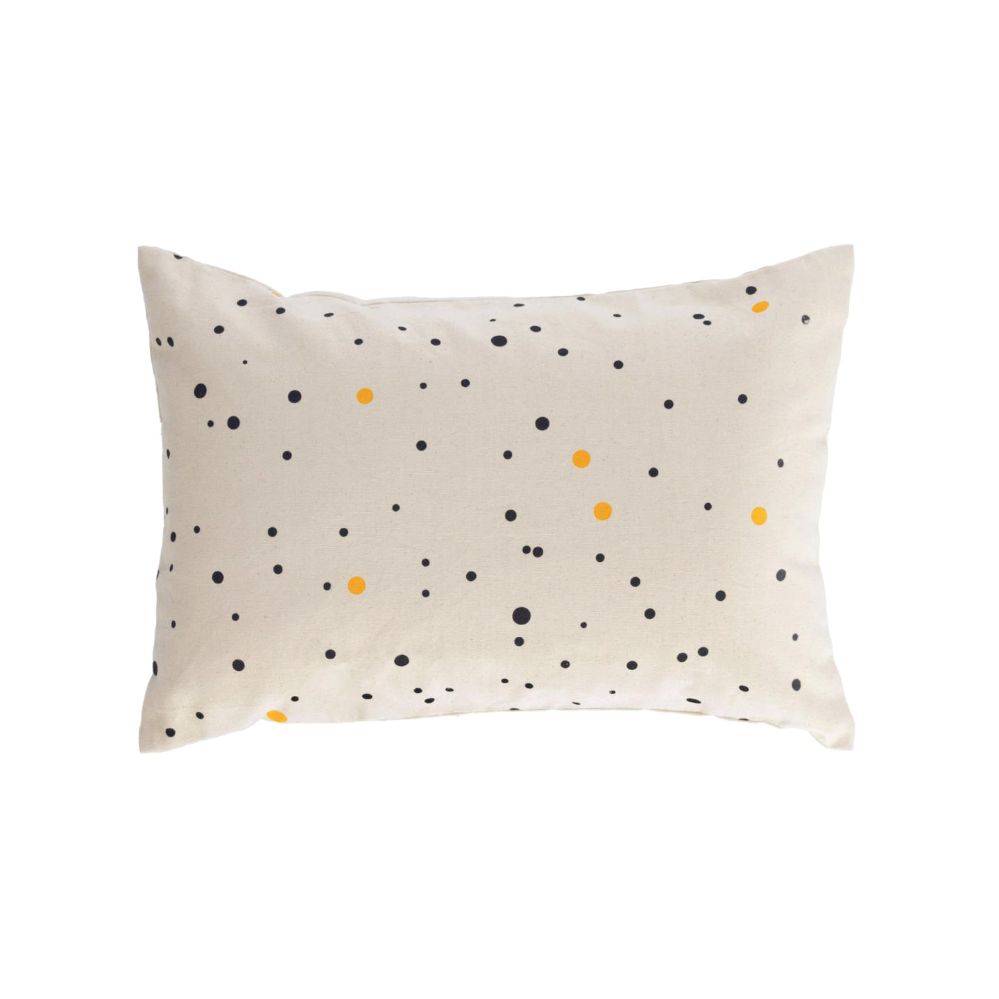 Travesseiro retangular bege com bolinhas pretas e amarelas.