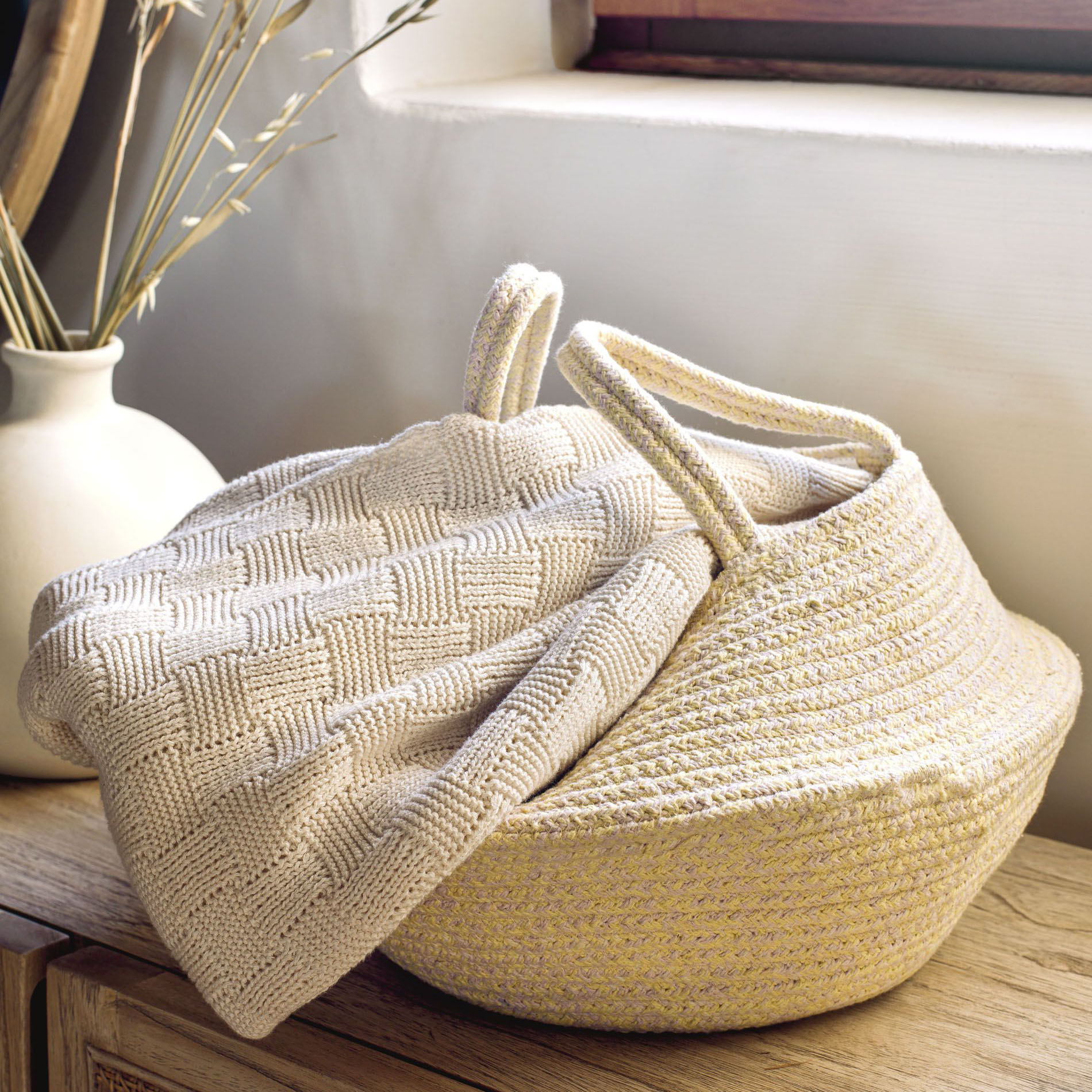 • Cesto bege claro de tecido entrelaçado com duas alças sobre mesa de madeira, perto de vaso e janela