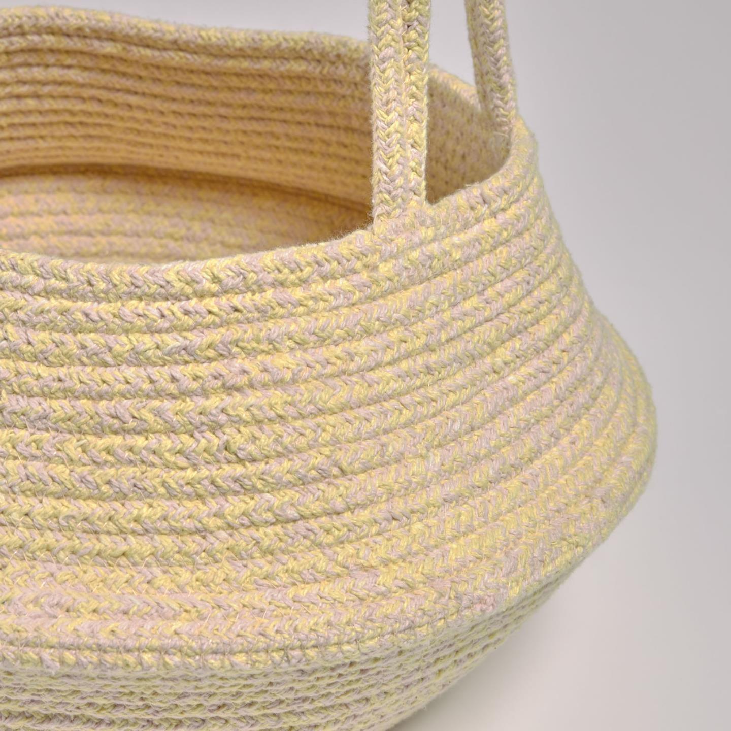 • Cesto tecido amarelo e branco com alça funda sobre fundo cinzento