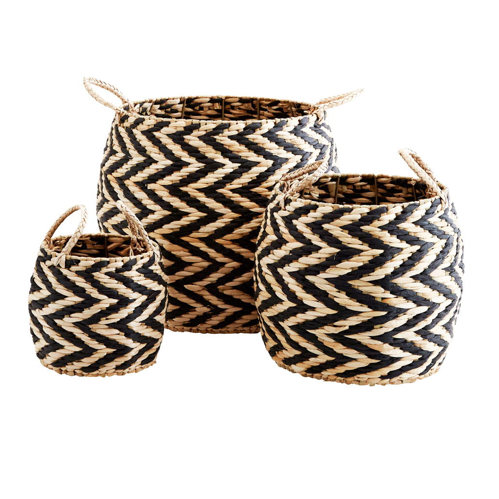 • Três cestos de palha com padrão zig-zag preto e natural, com alças, sobre fundo branco