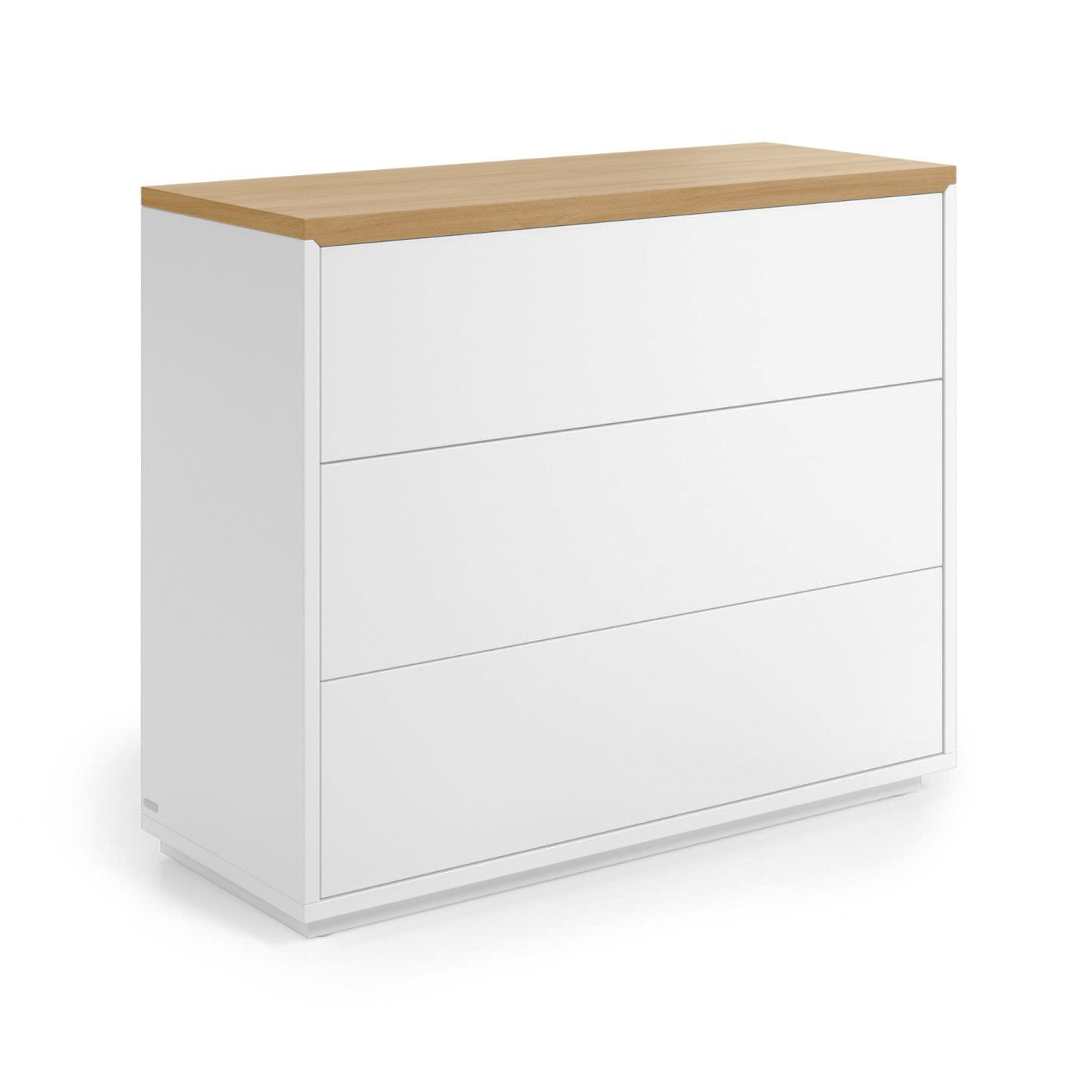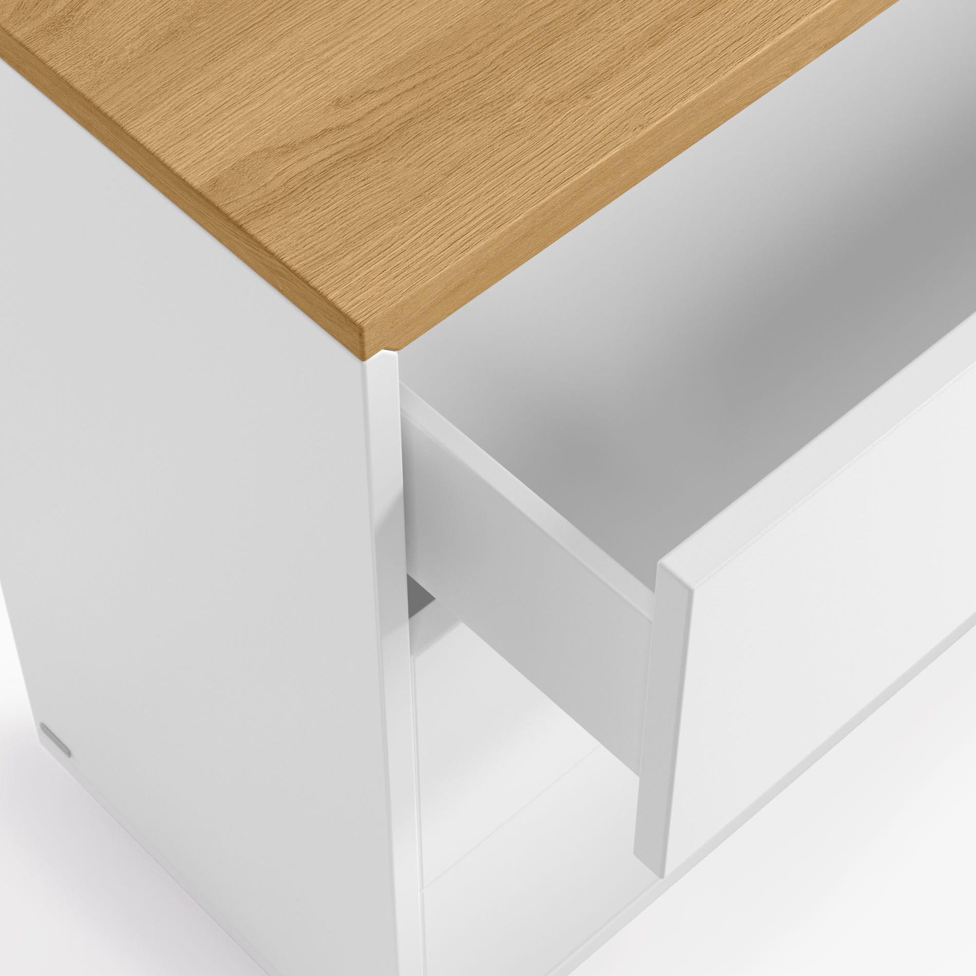 - Material das gavetas: MDF E0 (painel de fibra de densidade média com baixas emissões de formaldeído classe E0), Chapa de carvalho (Quercus alba)