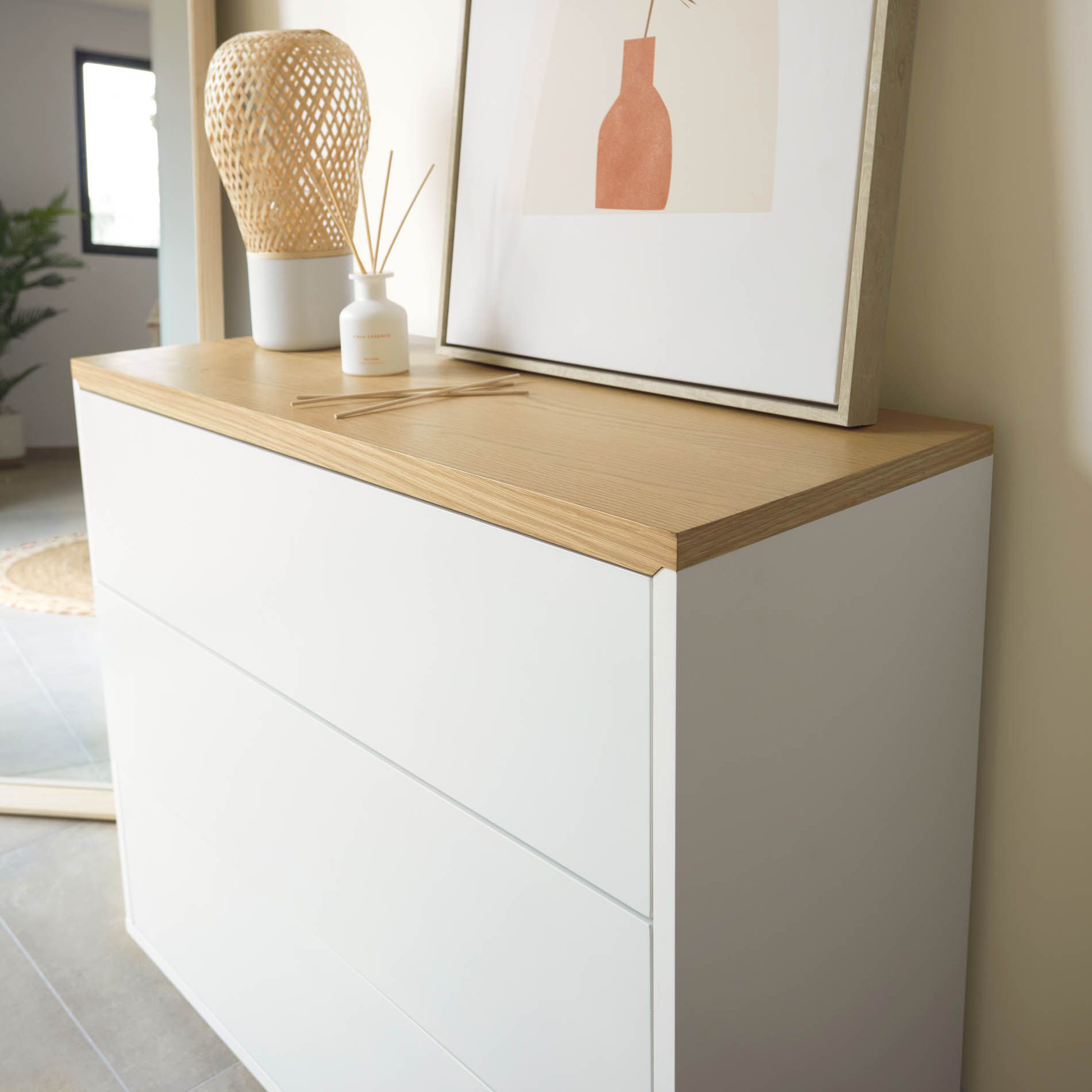 - Fabricado em chapa de carvalho e MDF com acabamento lacado.