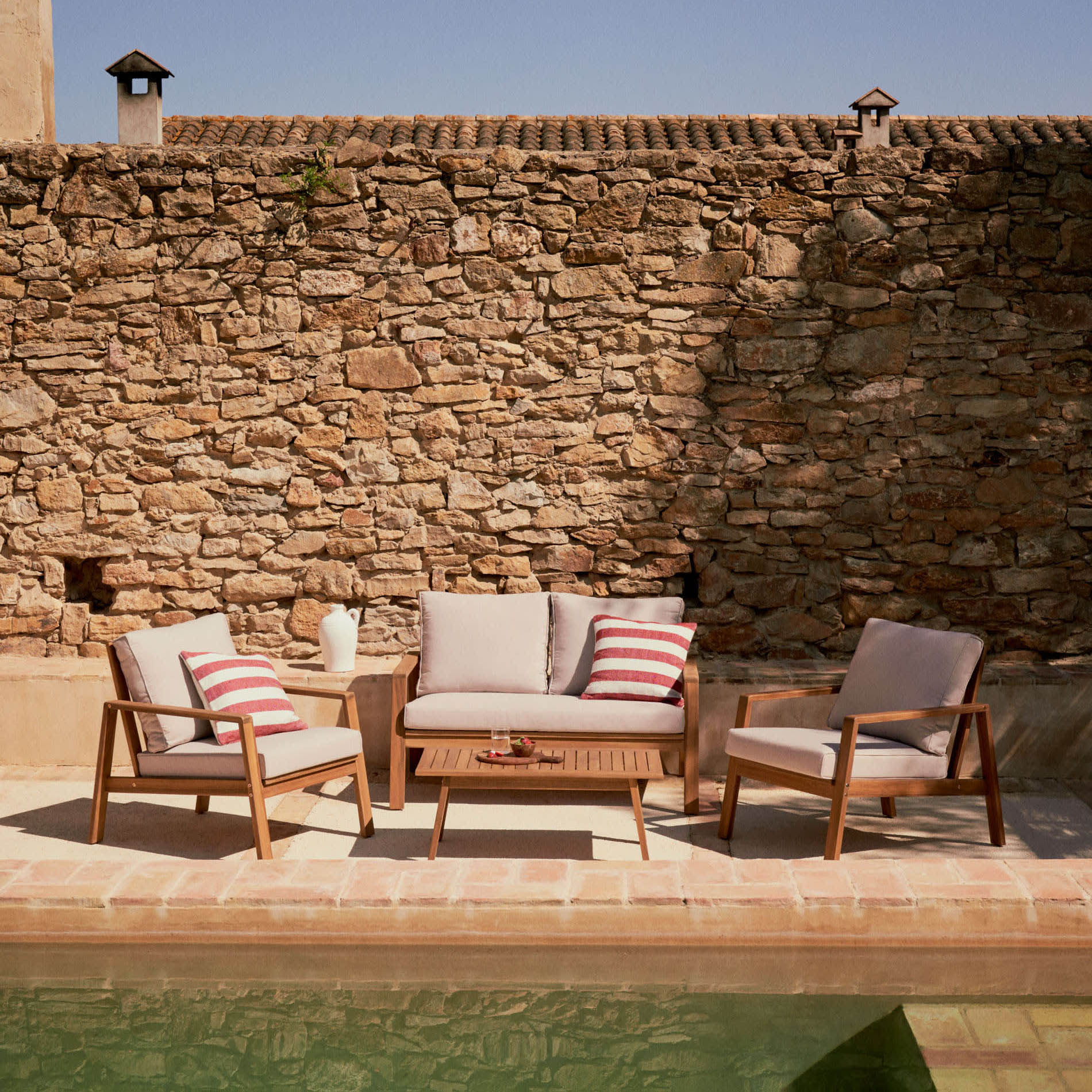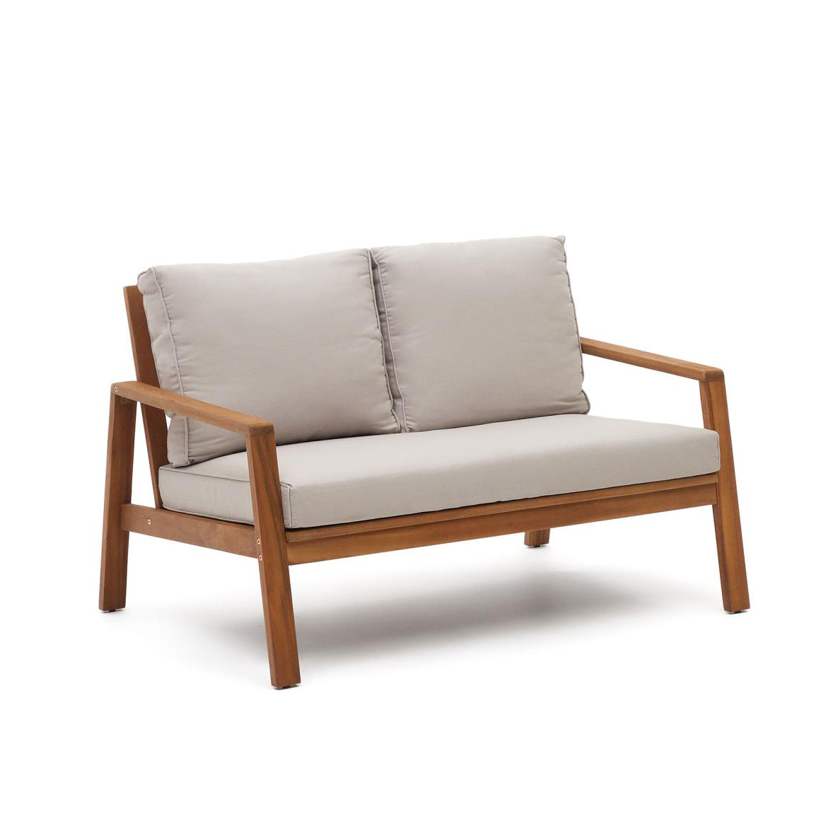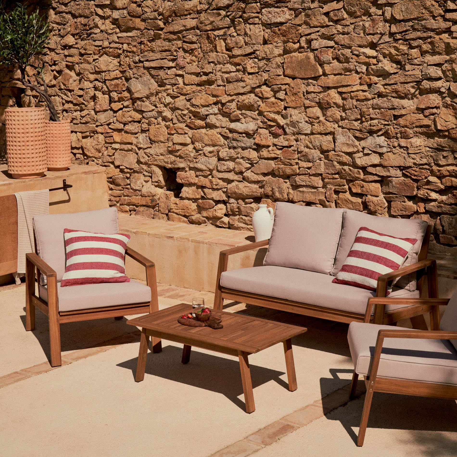 - Sofá 2 lugares, cadeirões e mesa de centro, feitos em madeira maciça de acácia com acabamento natural.