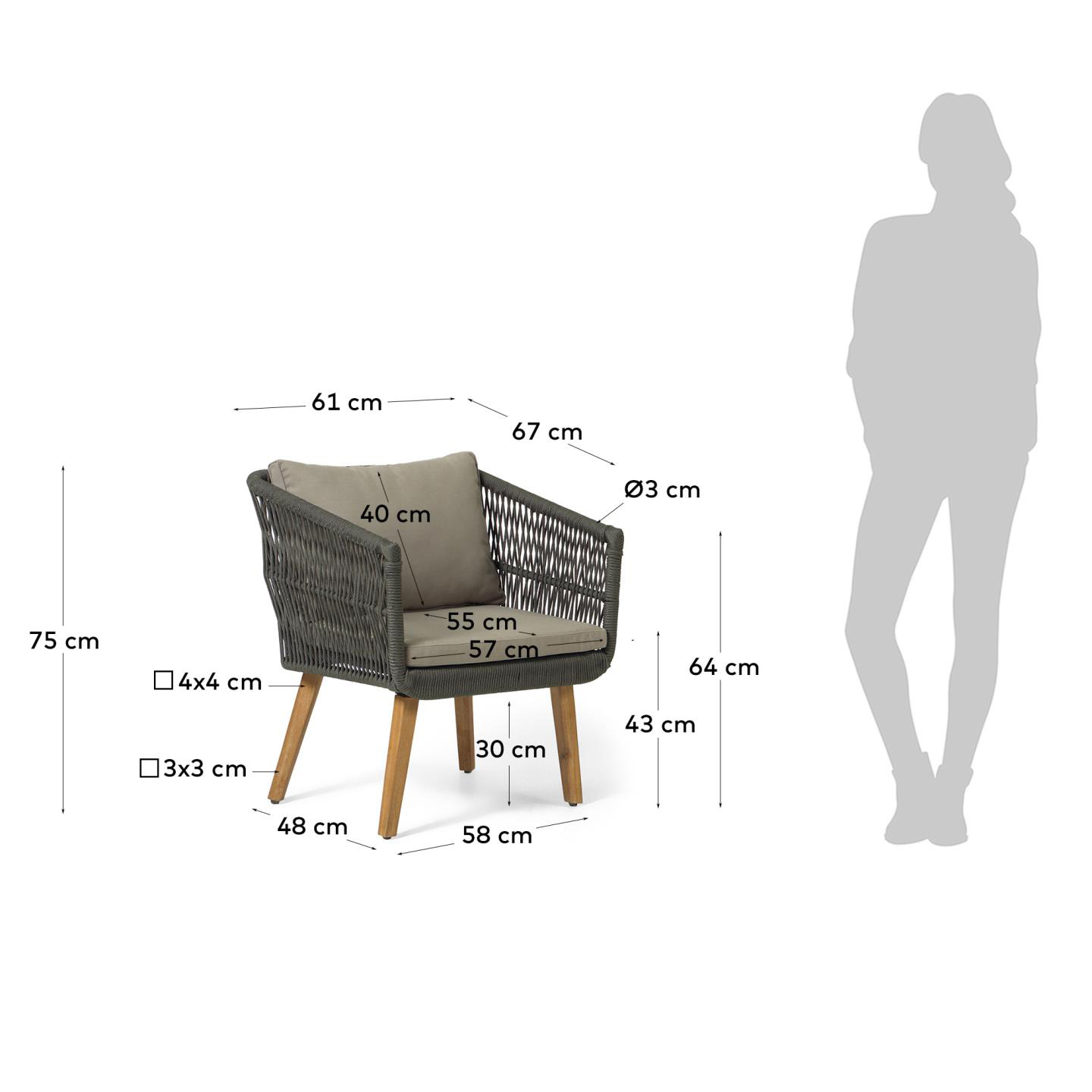 - Encosto em corda poliéster trançada à mão. Cor verde escuro.