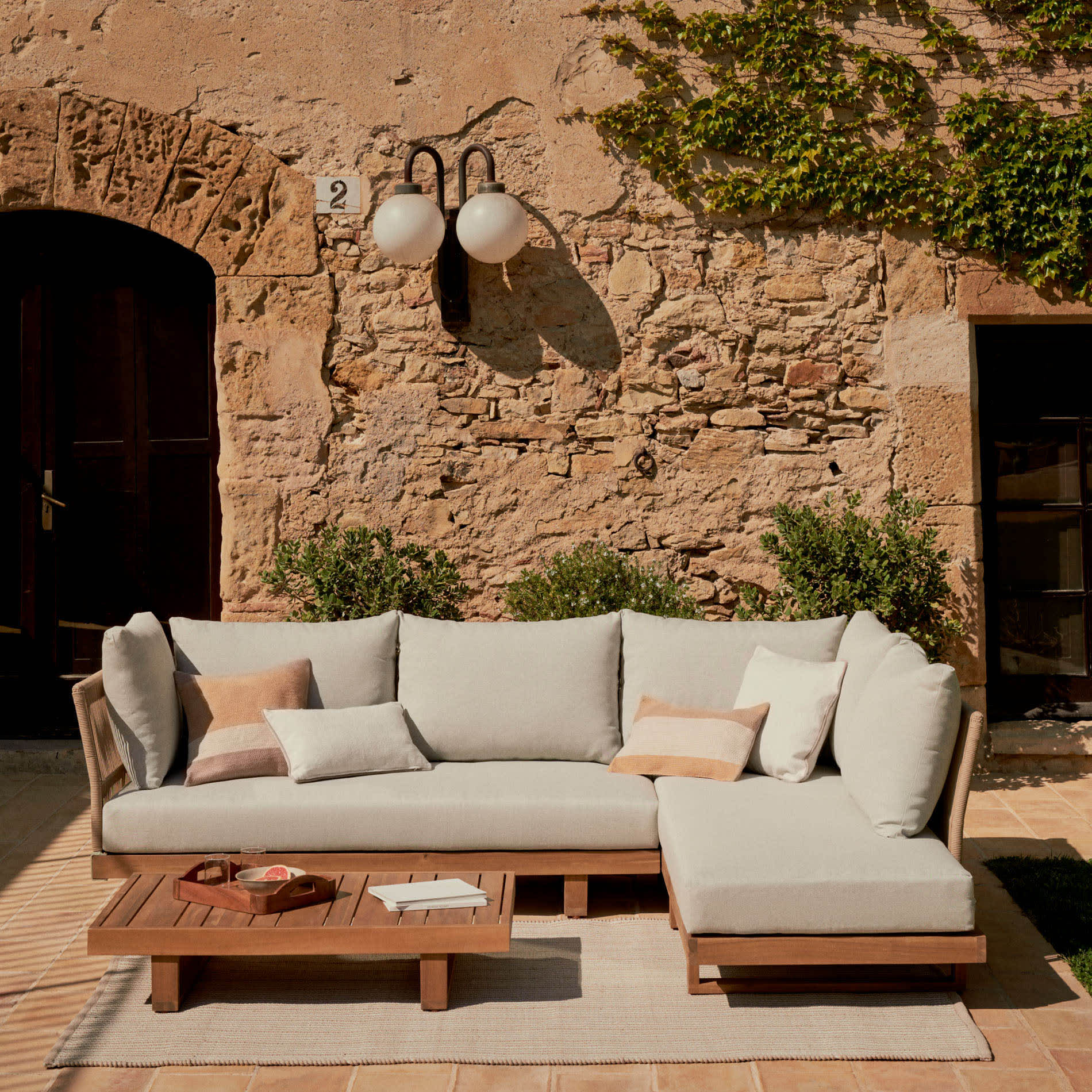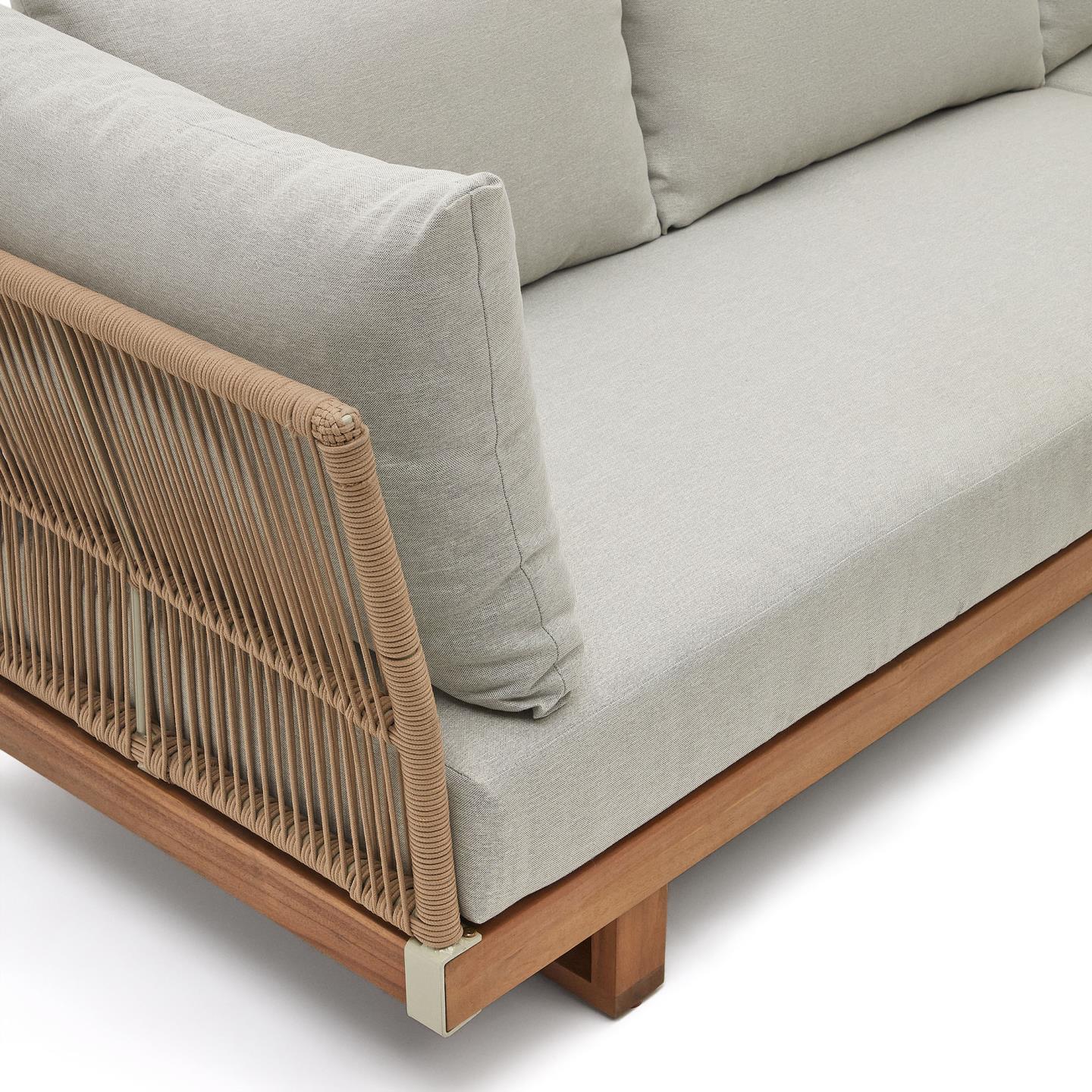 - Sofá de canto e mesa em madeira maciça de acácia.