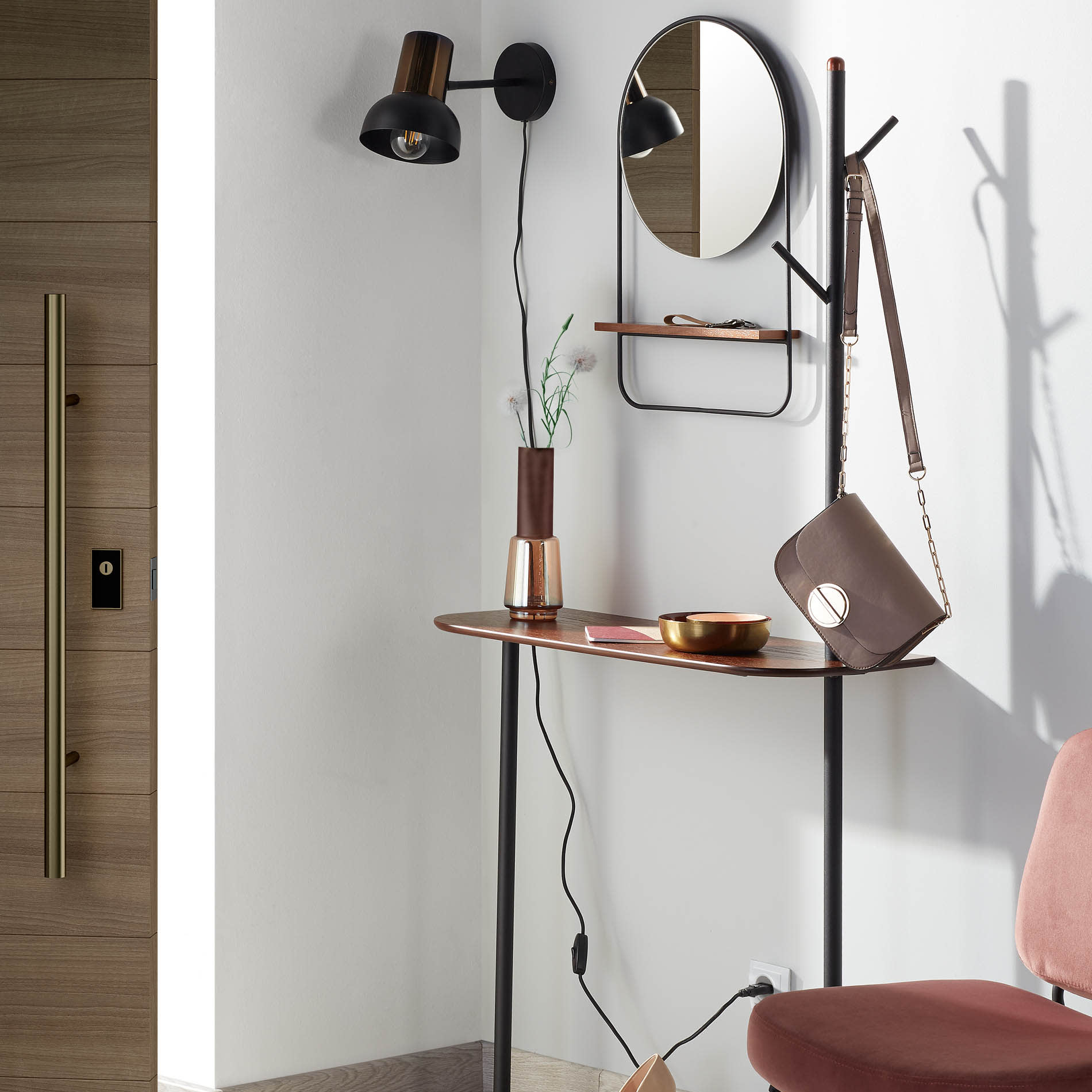 - A consola Marcoli com linhas minimalistas, destaca-se pelo cabide incorporado na mesma peça que permite guardar todos os seus acessórios de uso diário.