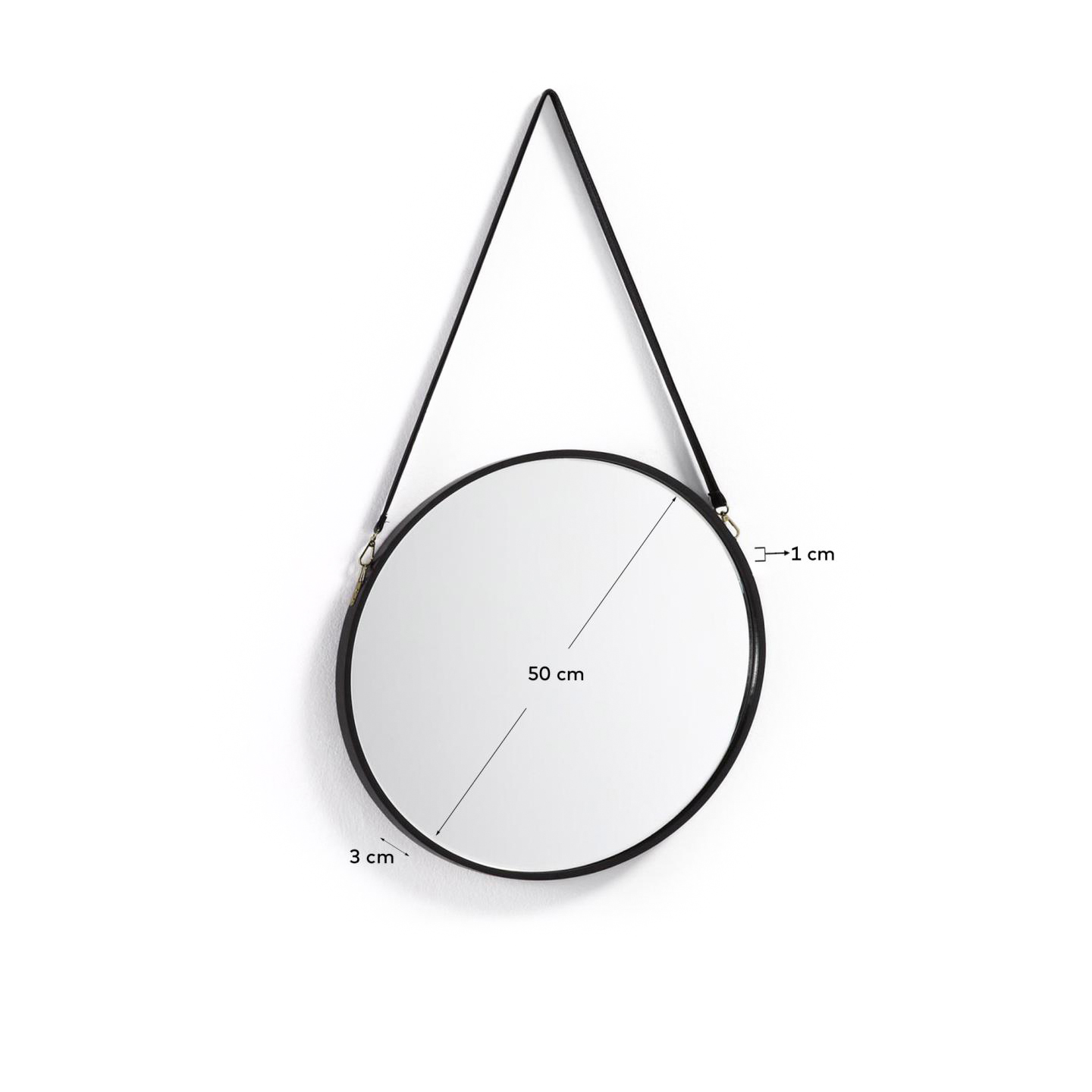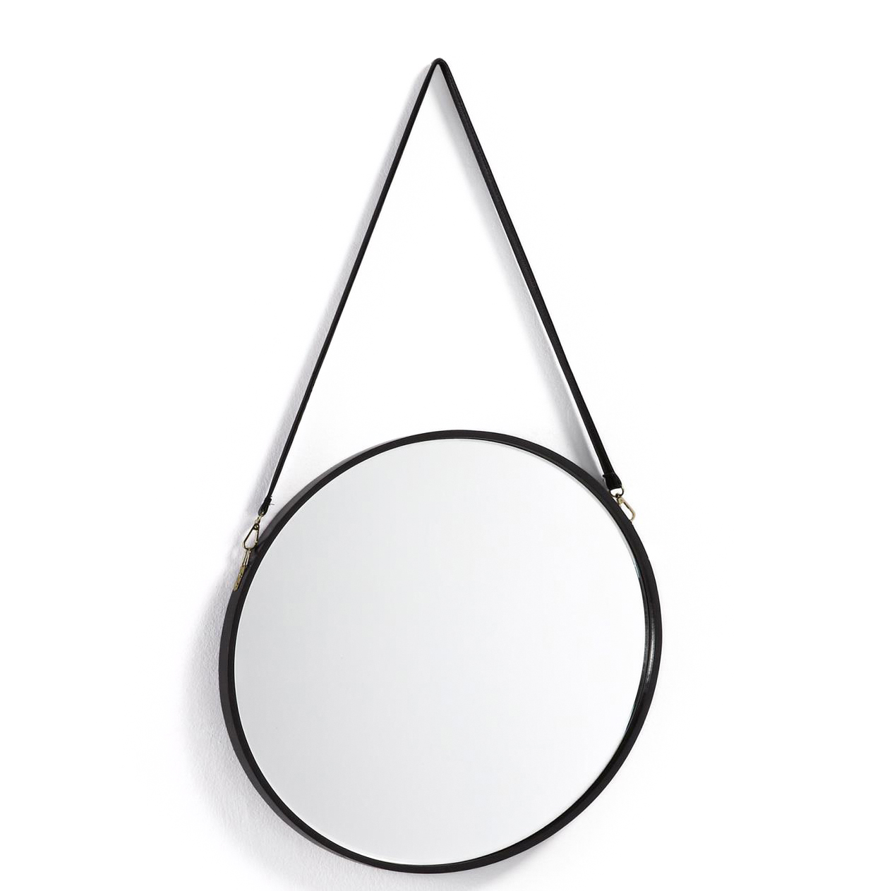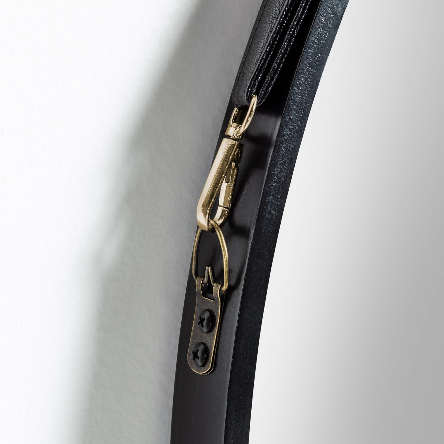 • Espelho redondo com moldura preta e correia preta pendurado na parede