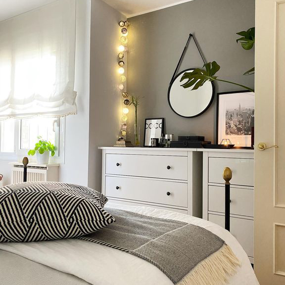 • Quarto decorado com cama, cómoda branca, almofada padrão geométrico, espelho redondo e planta verde