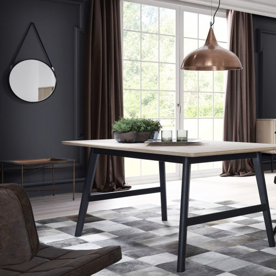 • Mesa de jantar branca com pernas pretas em sala moderna com tapete cinza geométrico, cadeira castanha, espelho redondo e candeeiro cobre