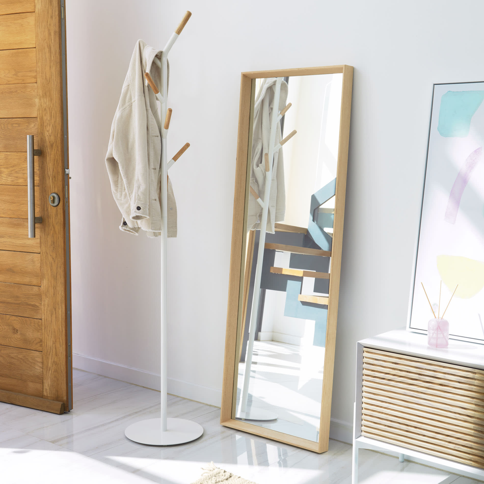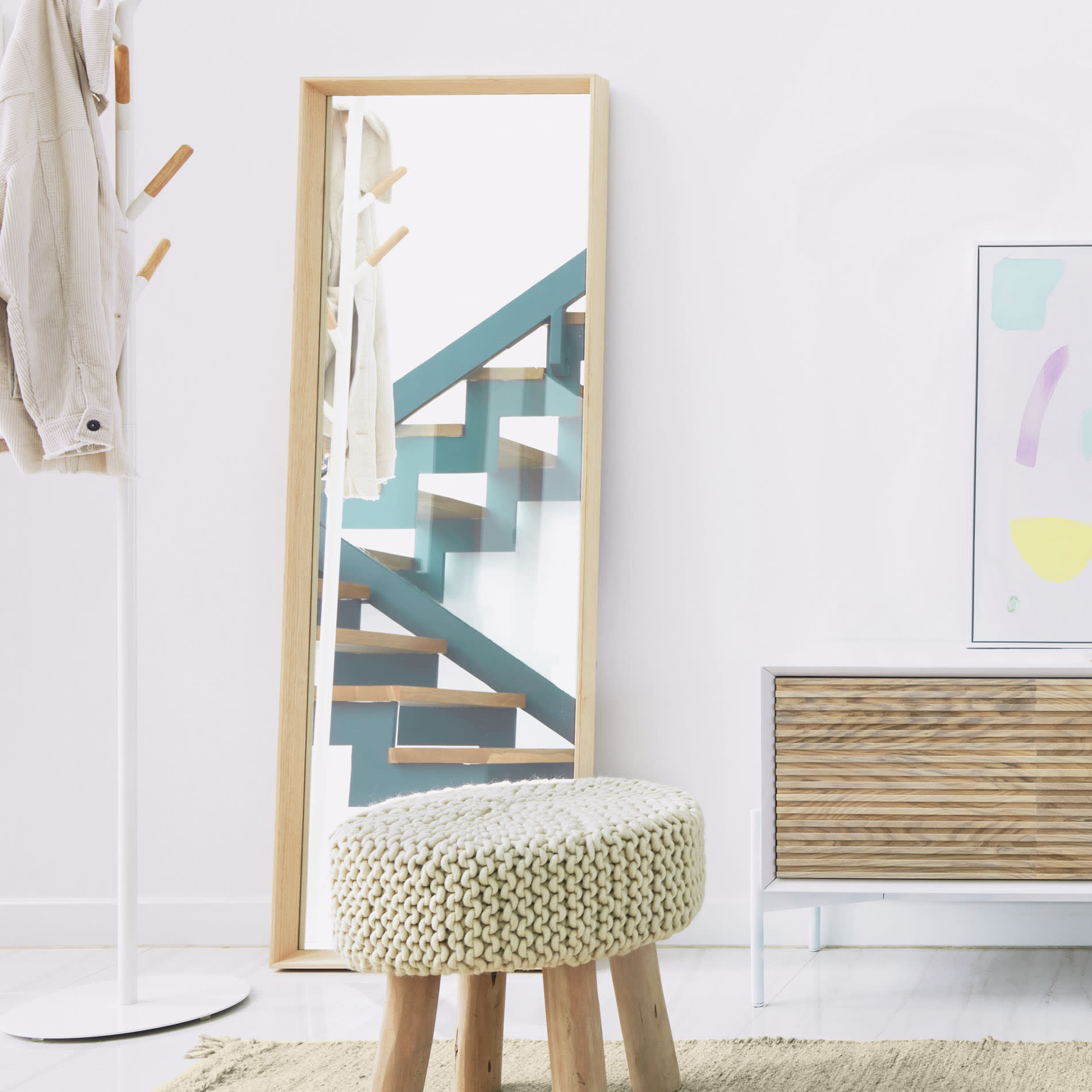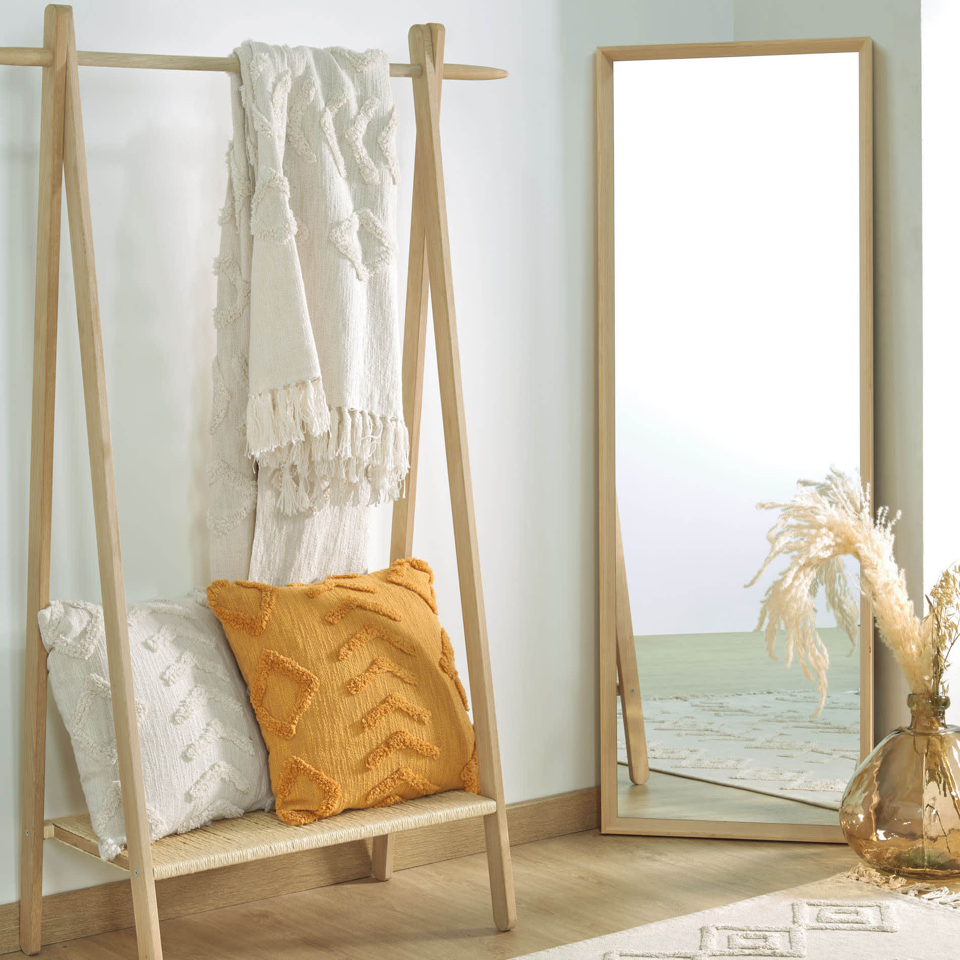 • Espelho de corpo inteiro com moldura de madeira, banco redondo com assento de malha creme, cabideiro branco e móvel baixo de madeira