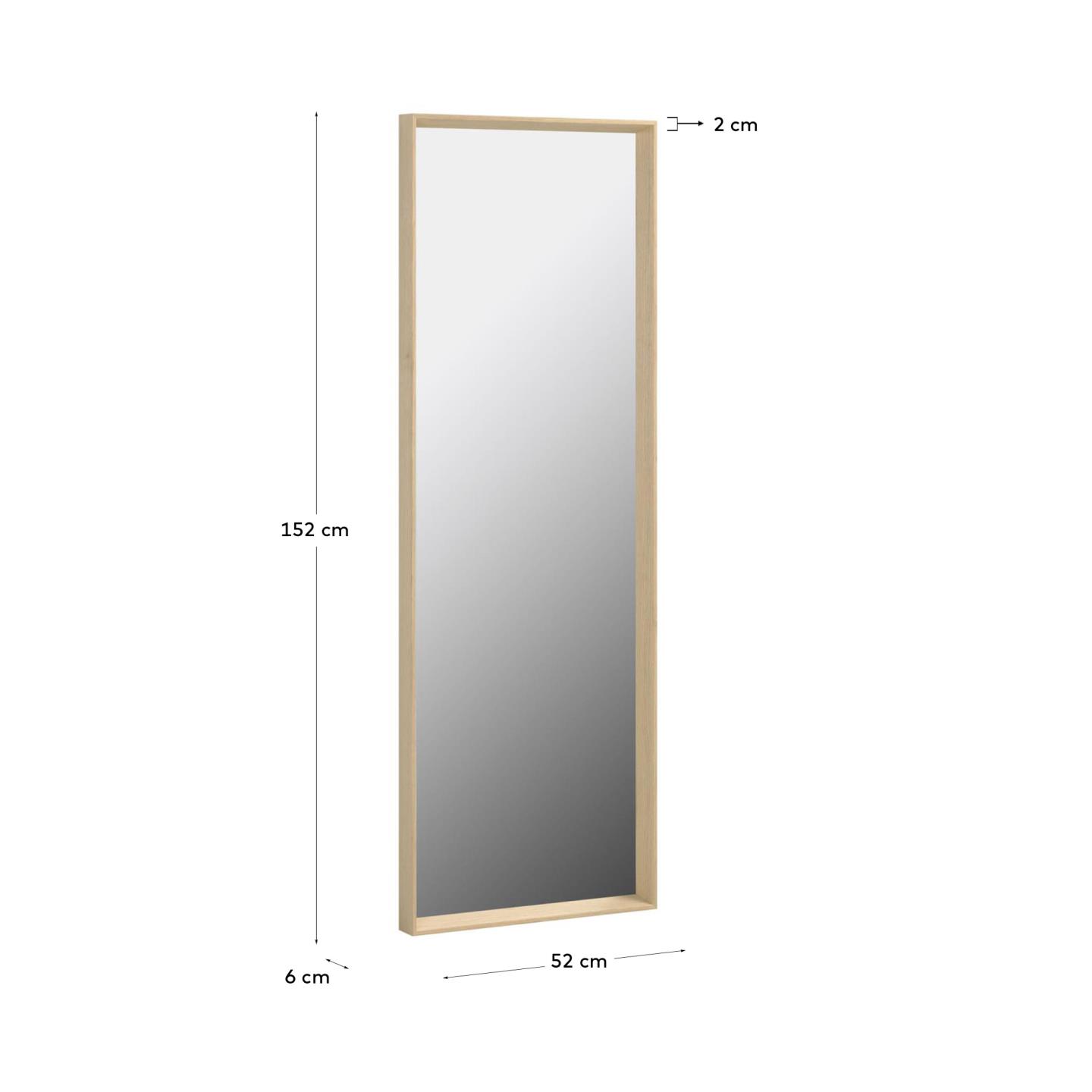 • espelho de corpo inteiro com moldura de madeira clara e medidas indicadas