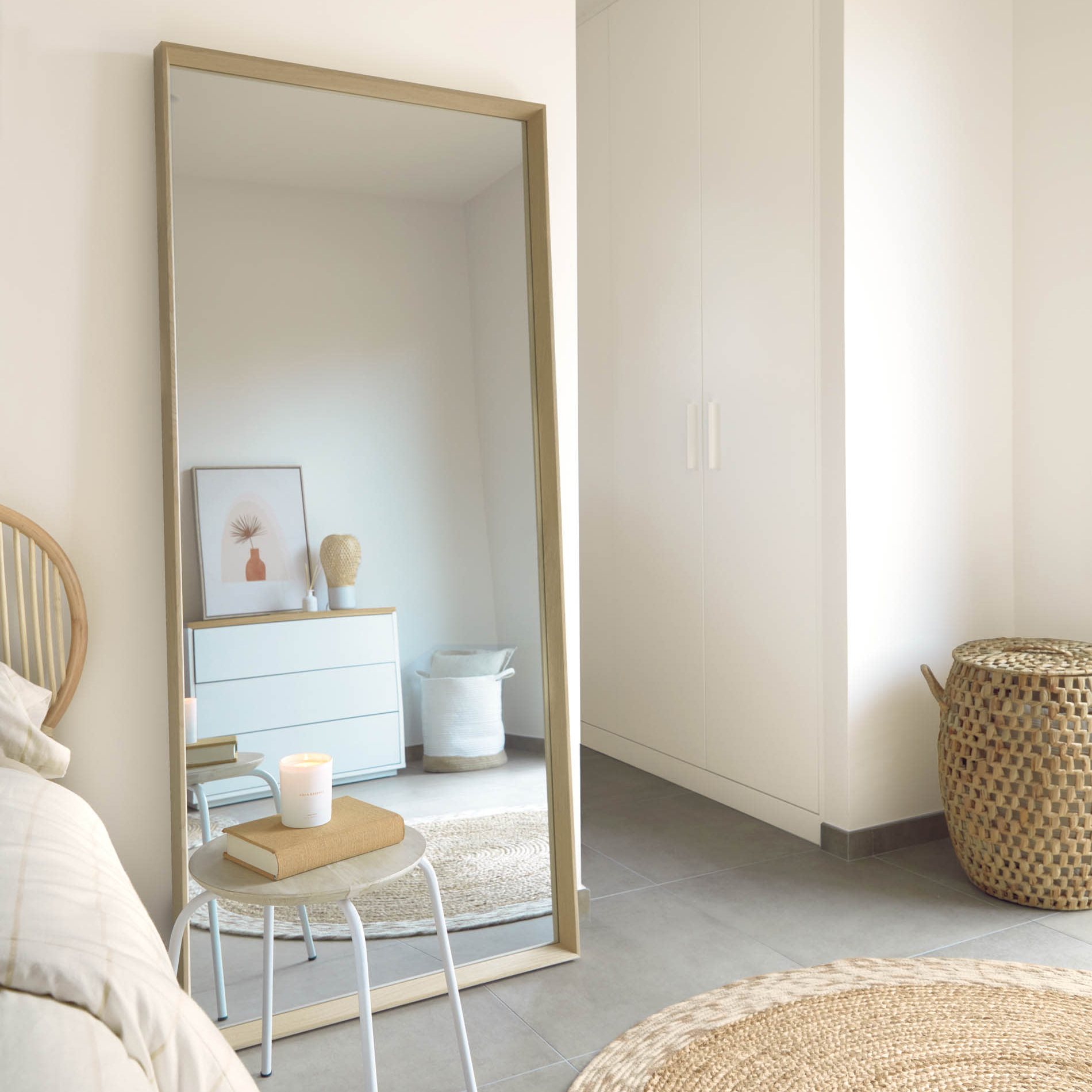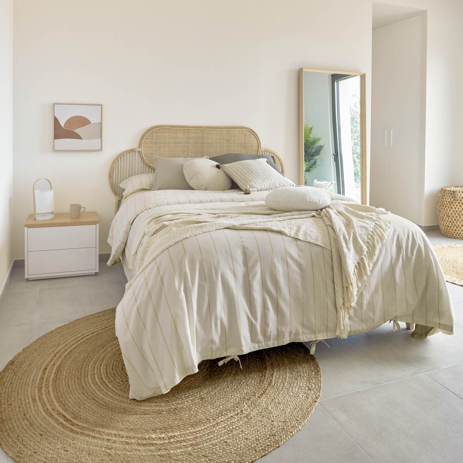 • Quarto com cama de rattan natural e roupa de cama creme, tapete de ráfia redondo, mesa de cabeceira branca e espelho vertical apoiado