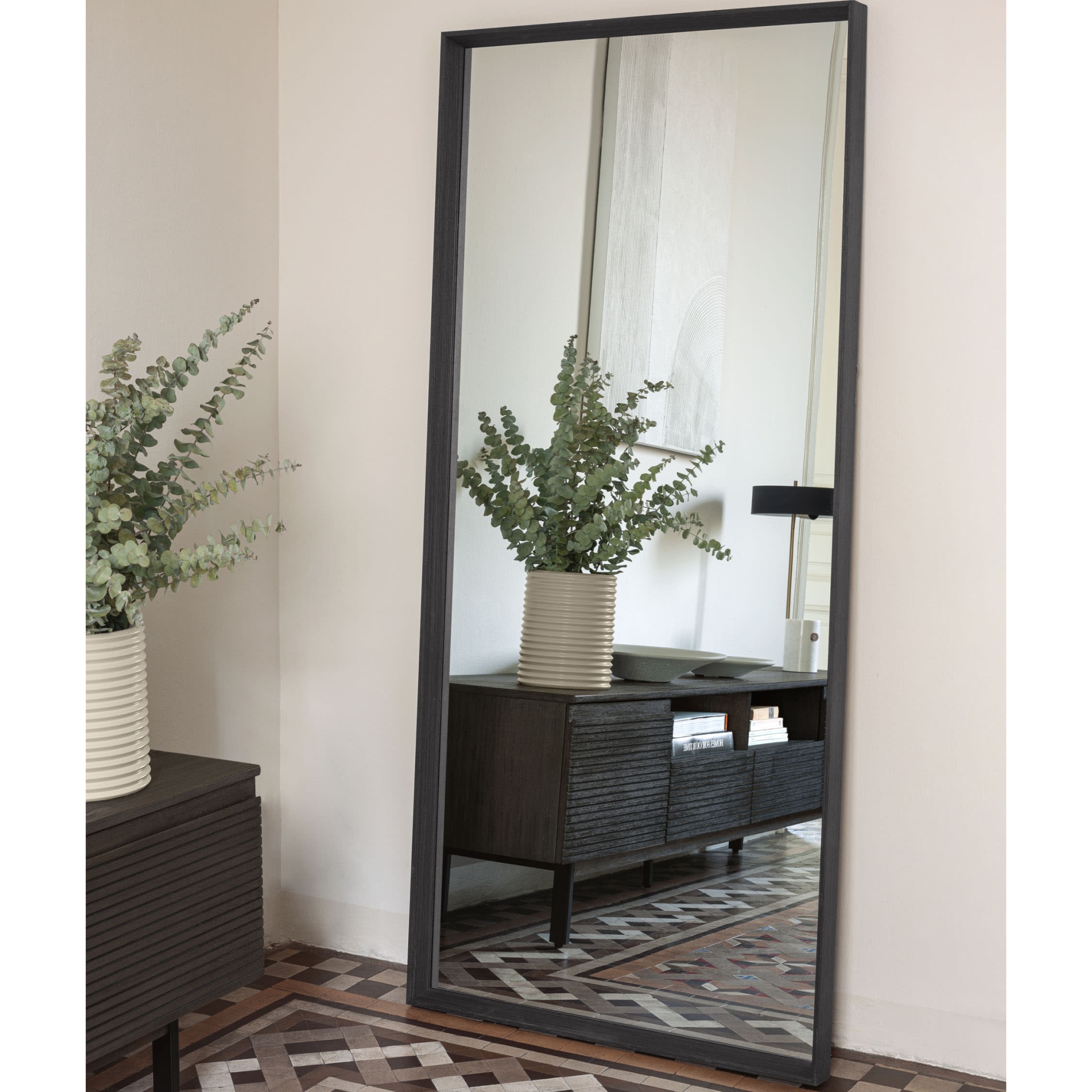 • Espelho de pé com moldura preta junto a parede branca