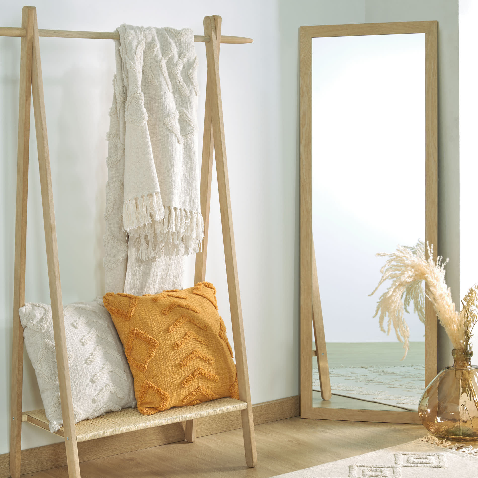 • Espelho vertical com moldura de madeira clara