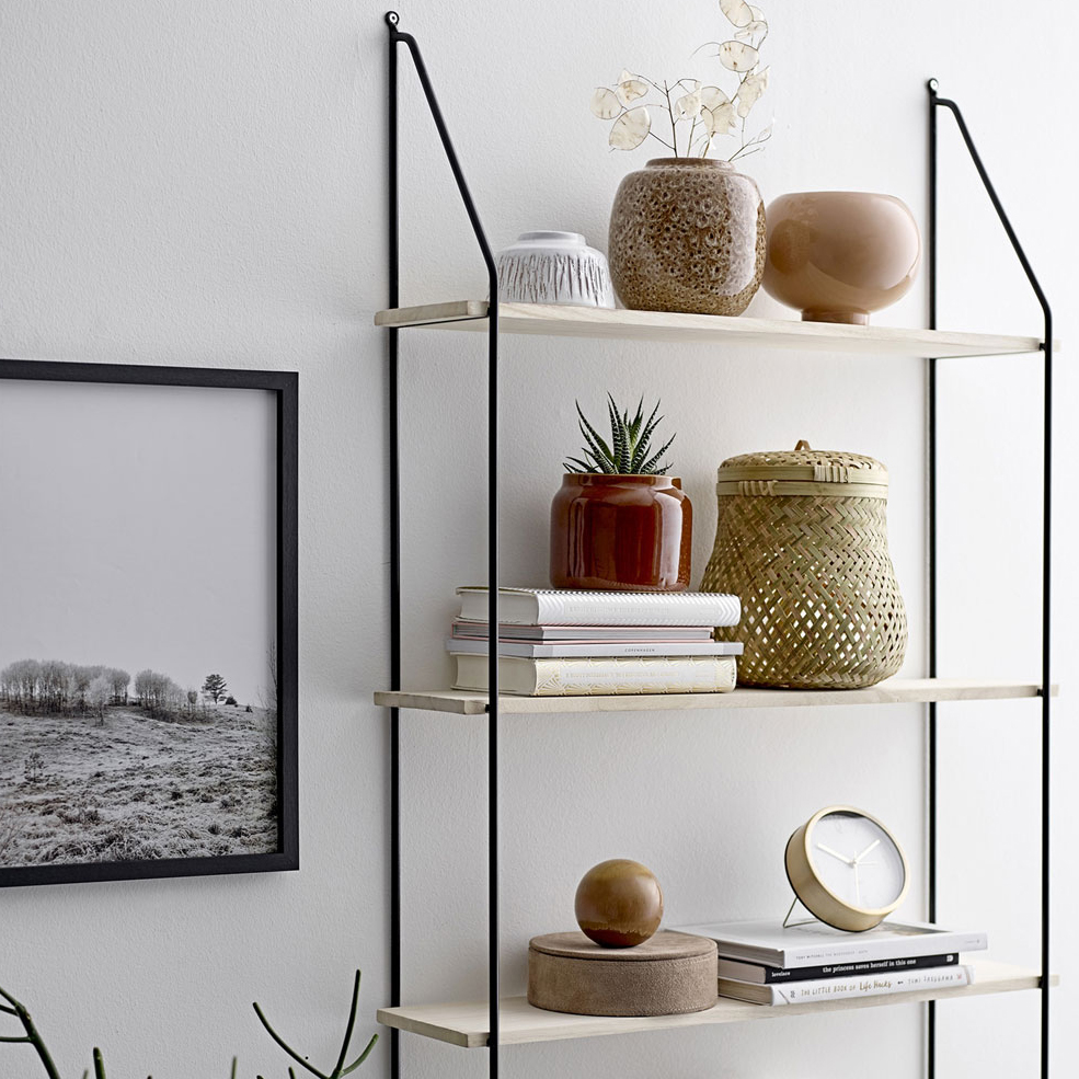 - A estante Lia de estilo nórdico da marca Bloomingville, destaca-se pela sua estética de linhas minimalistas que dão uma sensação de leveza e baseia-se na combinação entre madeira e metal.